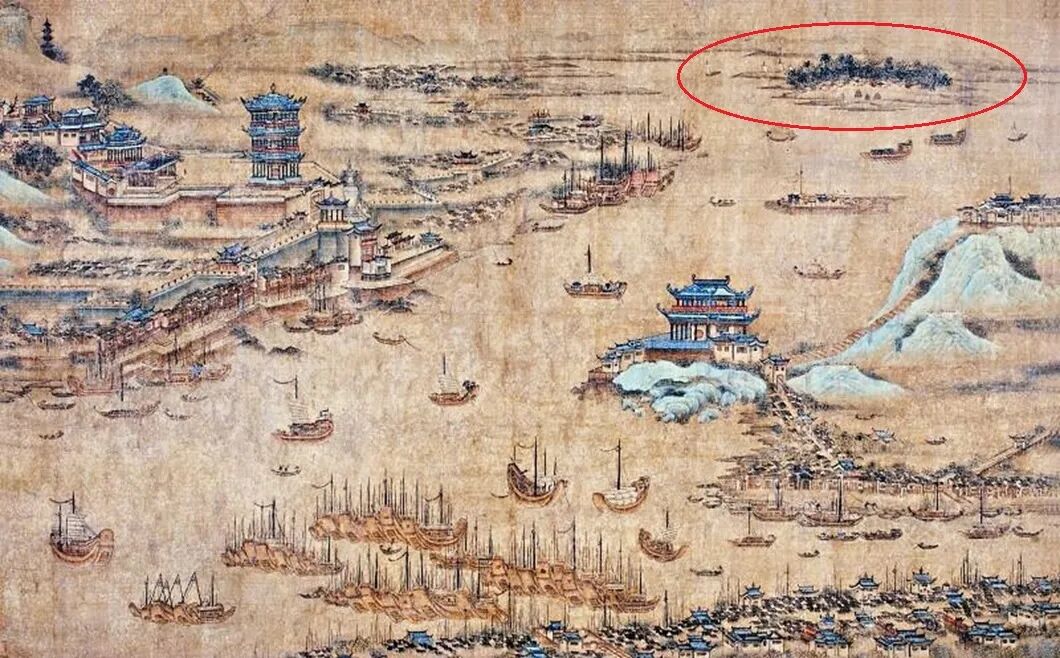 ▲鹦鹉洲在《江汉揽胜图》中右上角处(此地图上南下北)
