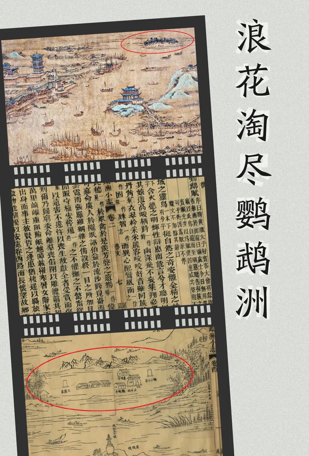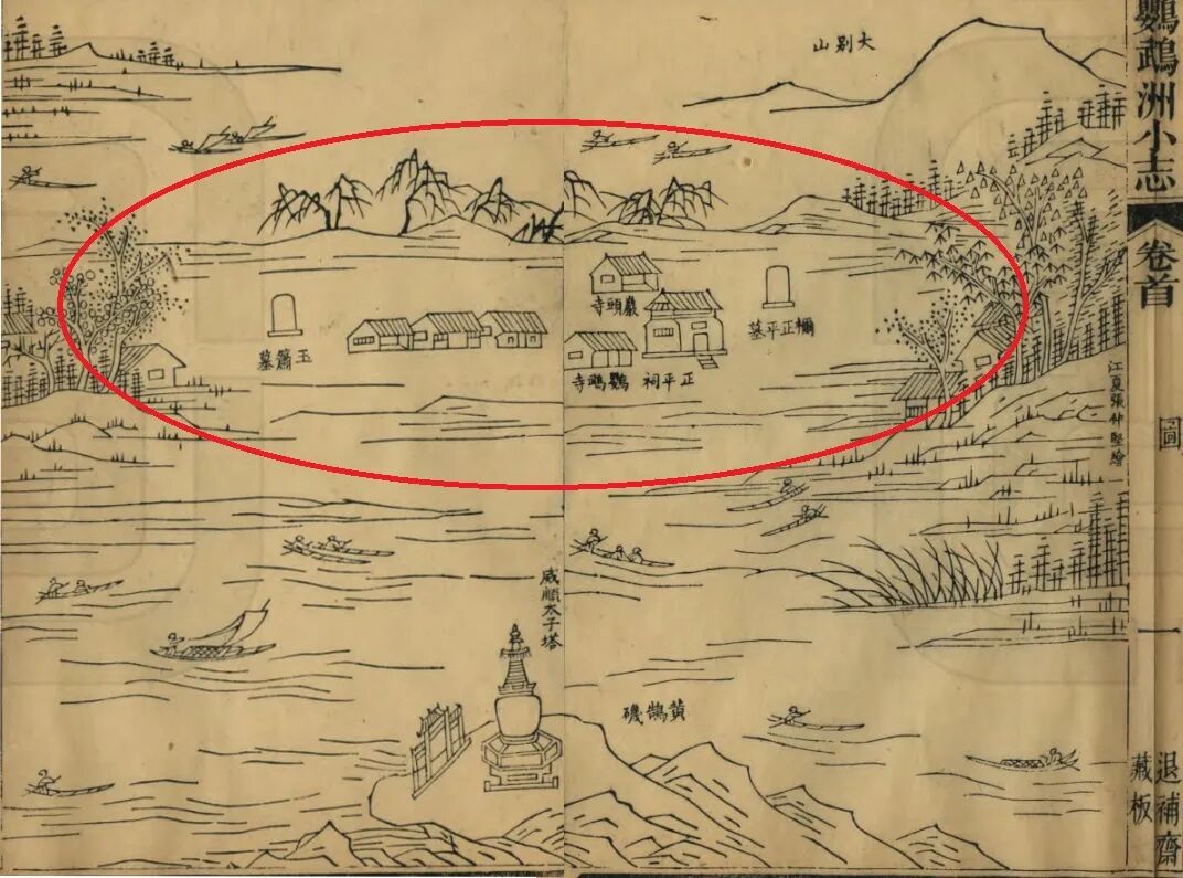 ▲在《鹦鹉洲小志》的描绘中,鹦鹉洲正对黄鹄矶,正平祠、墓就是为纪念祢衡所建