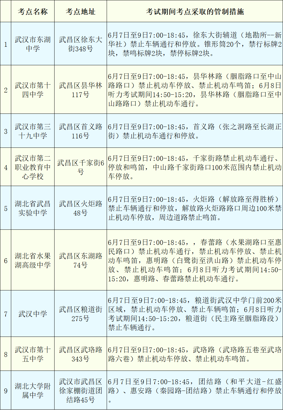 武昌区设有9个考点,分别为武汉市东湖中学、武汉市第十四中学、武汉市第三十九中学、武汉市第二职业教育中心学校、湖北省武昌实验中学、湖北省水果湖高级中学、武汉中学、武汉市第十五中学、湖北大学附属中学。6月7日至9日,将在考点周边采取交通管制措施(具体信息见下图)。