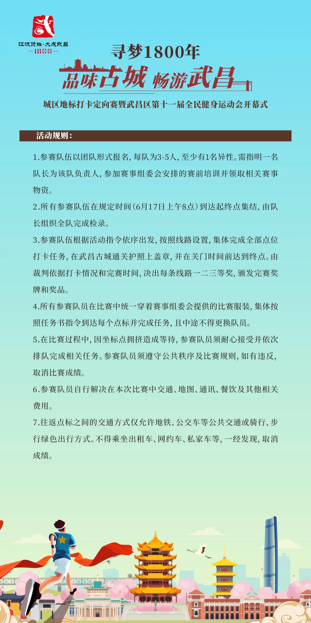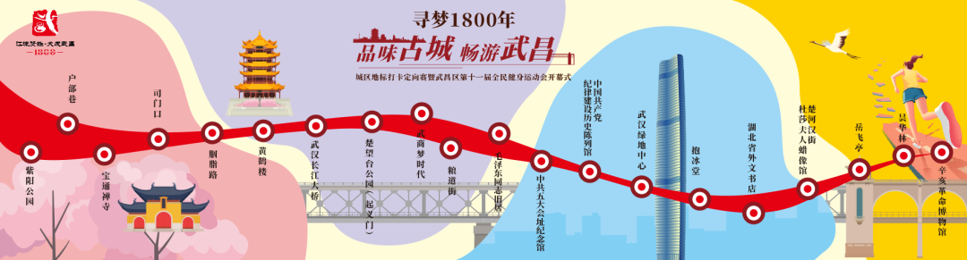 城区地标打卡定向赛是一场是以武昌区标志性建筑或区域为打卡点,穿越1800年的古城文化之旅。