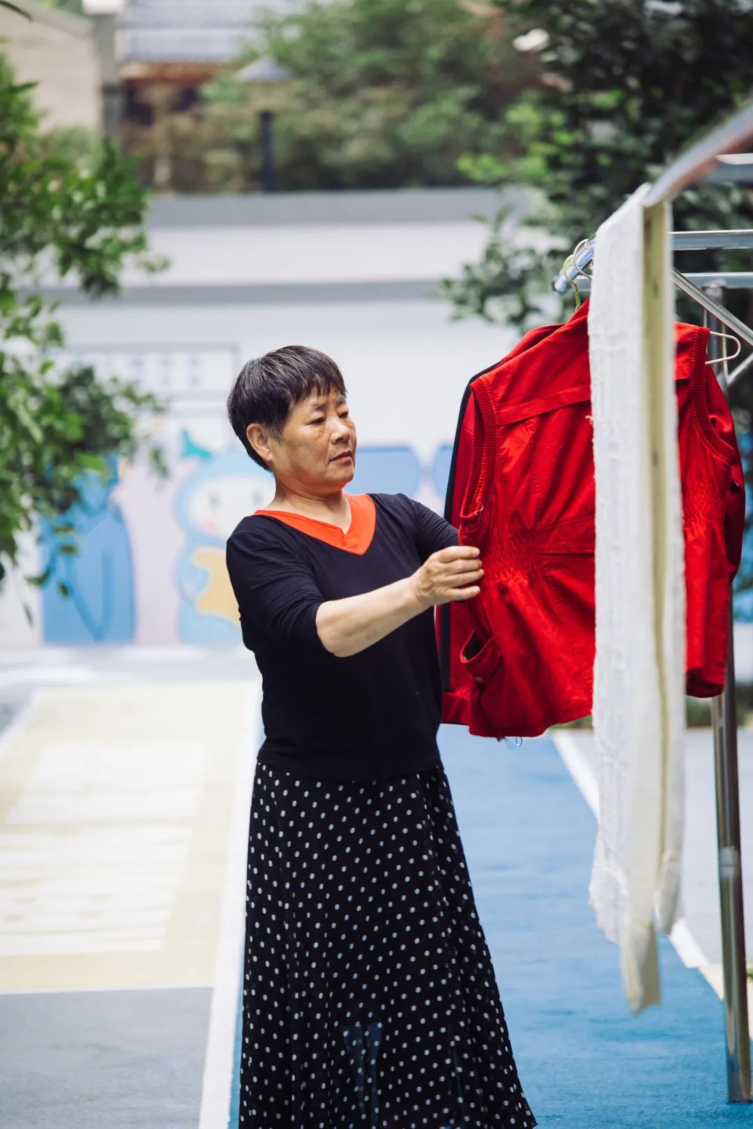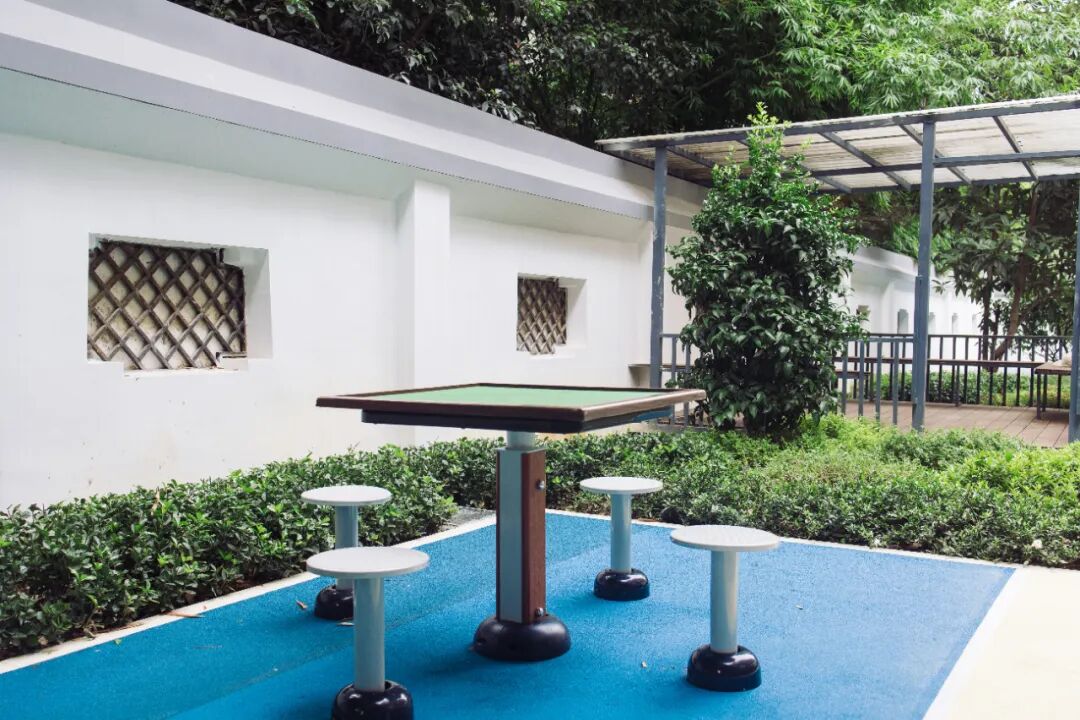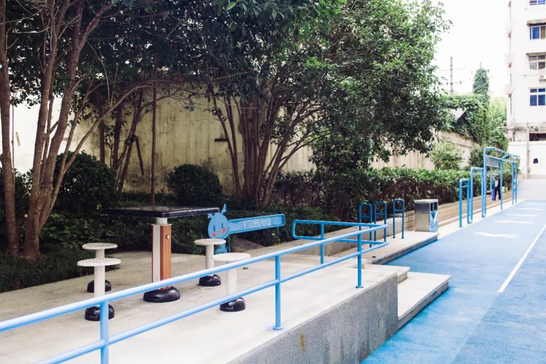 改造从入口开始,新铺的塑胶地面延伸到墙角,幽香书亭里安放了棋桌,环形扶手和晾衣架一样不少,五禽戏广场为太极爱好者量身打造。