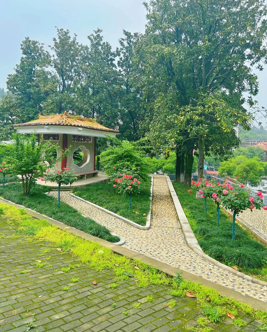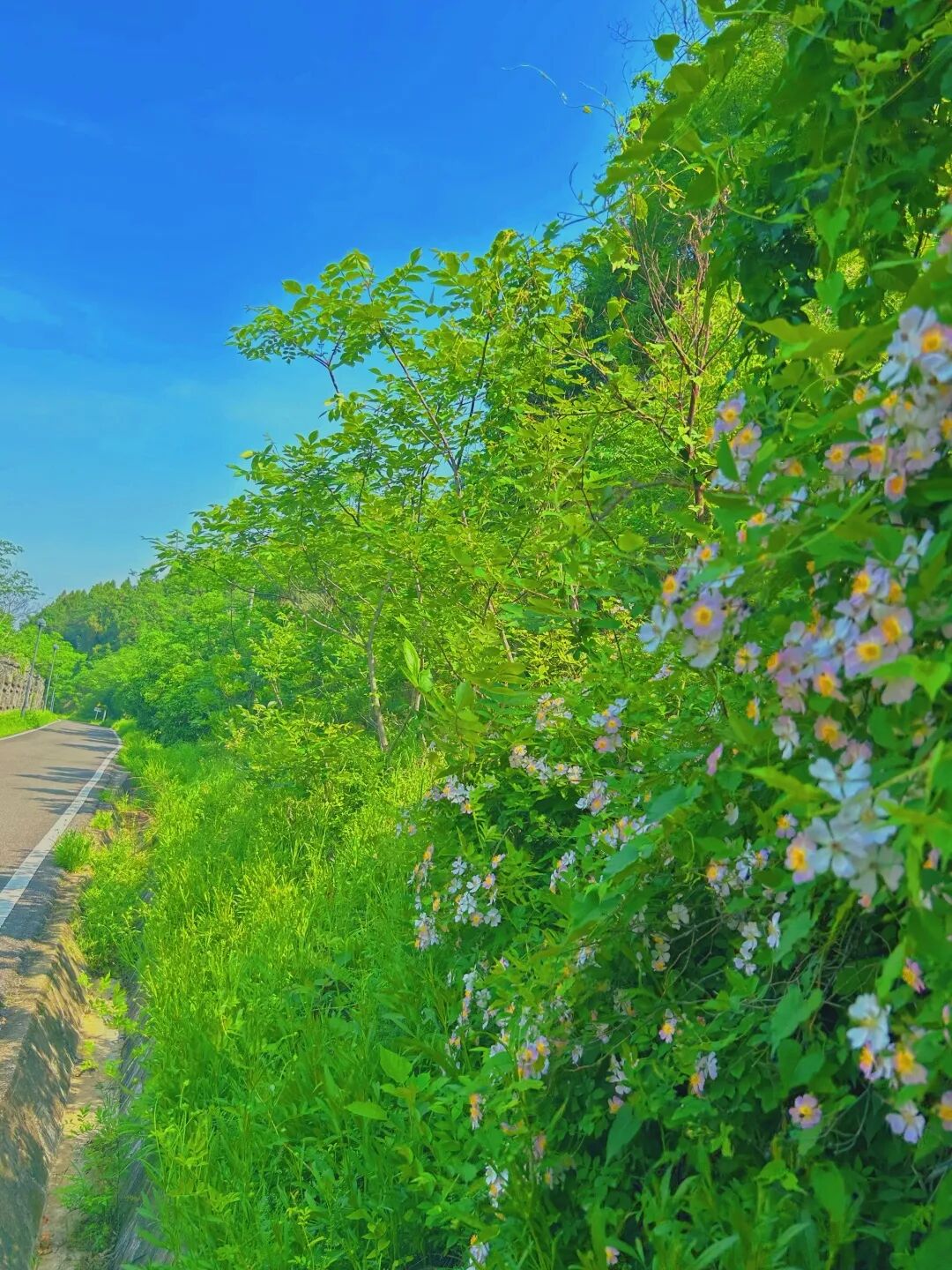 穿过绿意斑驳的轨道,一条开满鲜花的小路映入眼帘。姹紫嫣红的月季开满枝头,在微风中轻轻摇曳着,云朵在风里聚散合拢。