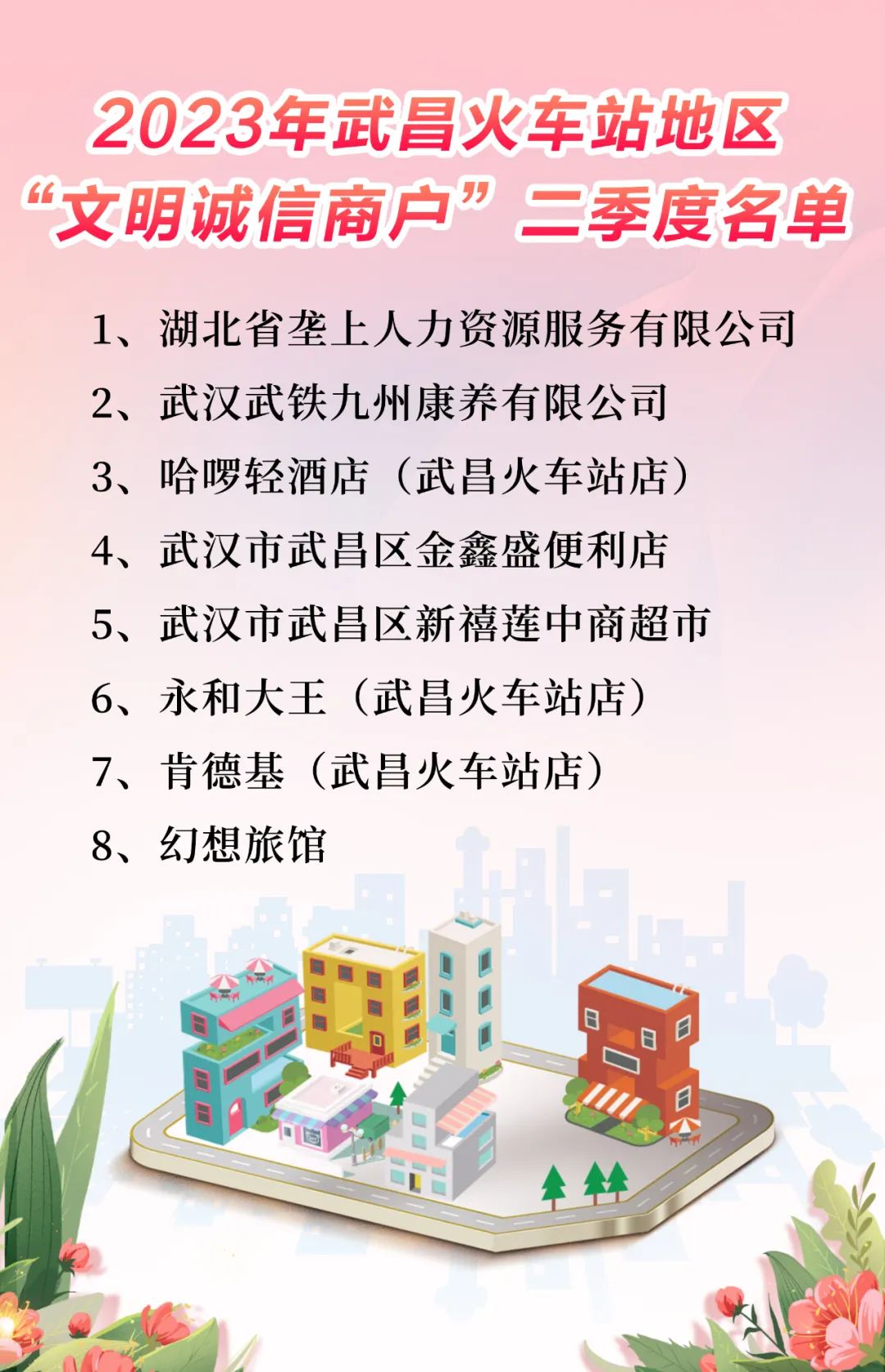 为优化武昌火车站地区营商环境,提升武昌火车站地区的文明水平,弘扬诚实守信的文明新风,共同缔造美好站区,近日,由武昌站区办联合武昌区文明办、武昌区市场监管局、首义路街道武南村社区、武昌火车站辖区商户共同举行的2023年武昌火车站地区“文明诚信商户”评选活动二季度评选结果出炉,共有8家商户被授予“文明诚信商户”荣誉称号,并统一授予“文明诚信商户”门牌标识。