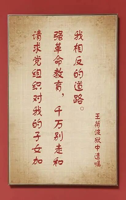 王荷波牺牲前唯一的嘱托是“请求党组织对他的子女加强革命教育,千万别走和他相反的道路”。正如王荷波期望的那样,对党忠诚从此成为他的家人忠实遵守的家风家训。二弟王介山由南洋归国从事秘密工作;三弟王代华长期担任党的地下工作负责人;四弟王凯在王荷波牺牲后,也被国民党逮捕,狱中10年,对党忠贞不渝,出狱后奔赴抗日救亡战场;长子王夏荣继承父志,在党的领导下参加抗日救亡工作,在南京殉难时年仅19岁;大女儿王晓珍和二女儿王修竹在新中国成立后都只是普通干部。