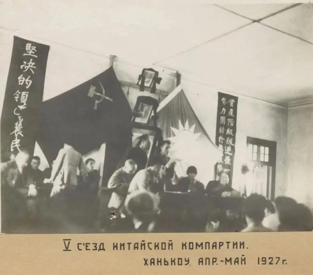 ▲中共五大会场主席台照片(照片下方俄文为:“1927年4—5月,中共五次代表大会”)