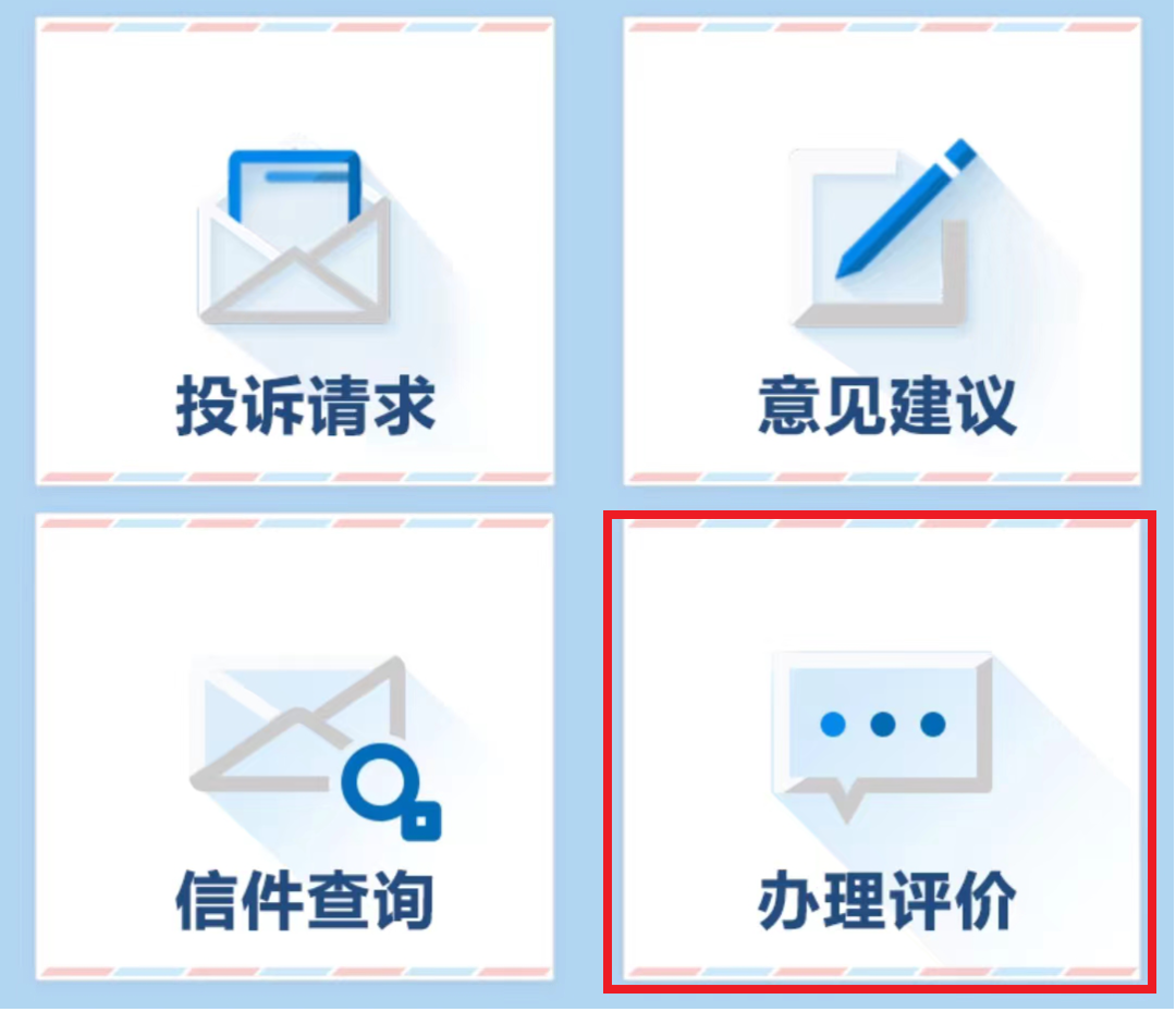 第五步:进入小程序首页,点击【办理评价】,对办理过程及结果进行评价