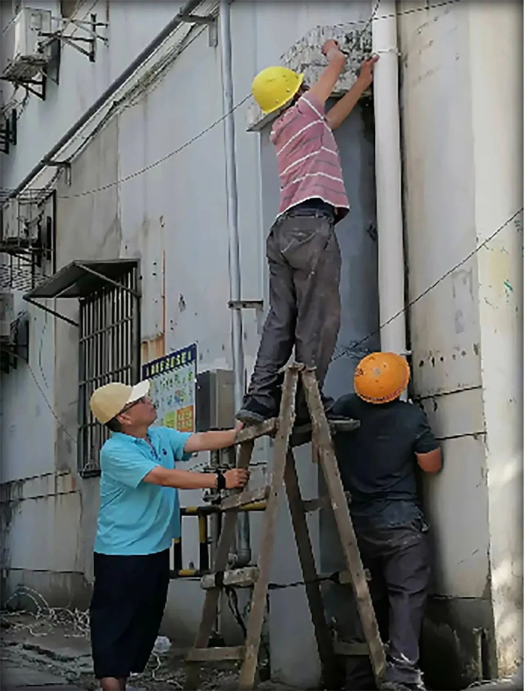 解放桥社区一处无物业管理的老旧宿舍楼,楼房外墙的多个雨水管出现不同程度的缺失和损坏,逢雨必会渗水。邻里长鲍军师傅在邻里“解”访中了解情况后,第一时间组织居民代表在楼下长凳上召开了“微邻”议事会,收集大家的意见和建议。社区党委以“五共”理念为遵循,充分汇集民智,链接下沉单位资源,最终确定了“企业出大头、居民出小头”的分摊众筹模式,共同解决了排水管维修更换的资金问题。因为施工要涉及高空作业、高压线区,邻里长们大清早就来到现场进行协助,很多居民在邻里长的带动下也参与进来,主动挪车、拆除自家晾衣架,甚至牺牲午休时间也要帮忙看管工具,历经10个小时终于将外墙雨水管更换完毕,收获了居民的一致好评。
