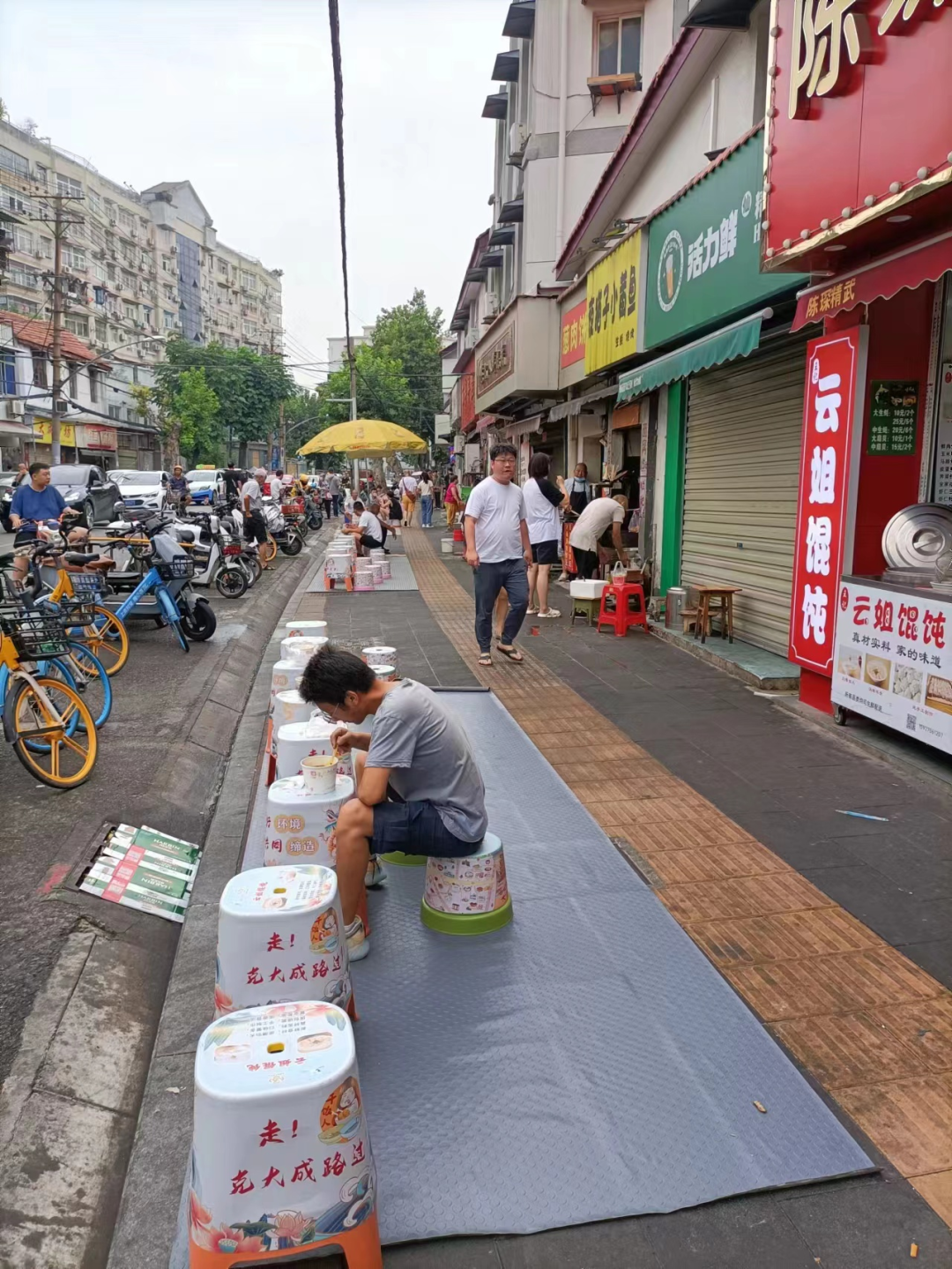 ▲在商户门前设置板凳、铺设防油垫,助力大成路外摆经济