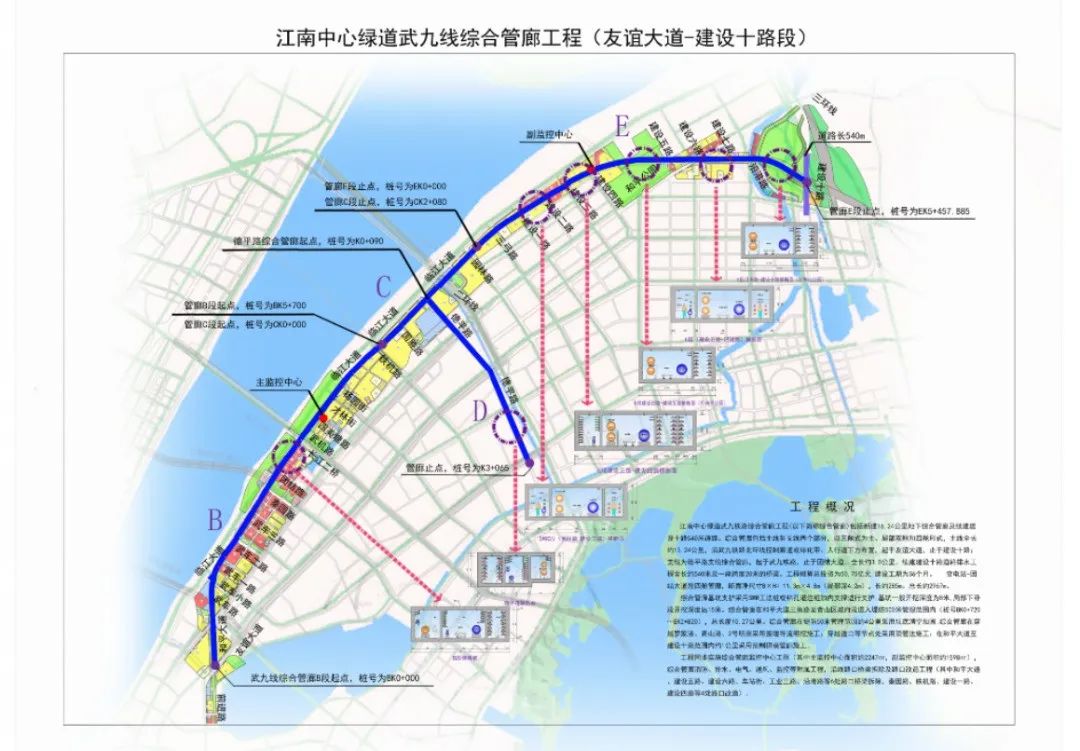 武九综合管廊工程是省市两级重点工程,主要沿武九铁路北环线布设,分主线管廊和支线管廊两部分,全长约16.2公里,是武汉市城市地下综合管廊专项规划确定的重要干线管廊,创下多个“国内之最”。