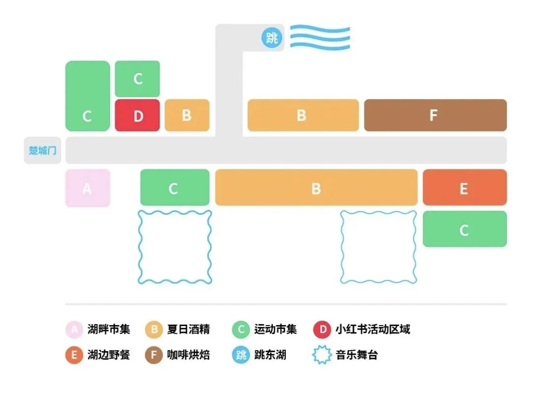 市集也是跳东湖的重头戏,4大板块,70多个摊位,好吃好喝好玩全覆盖,先剧透一下: