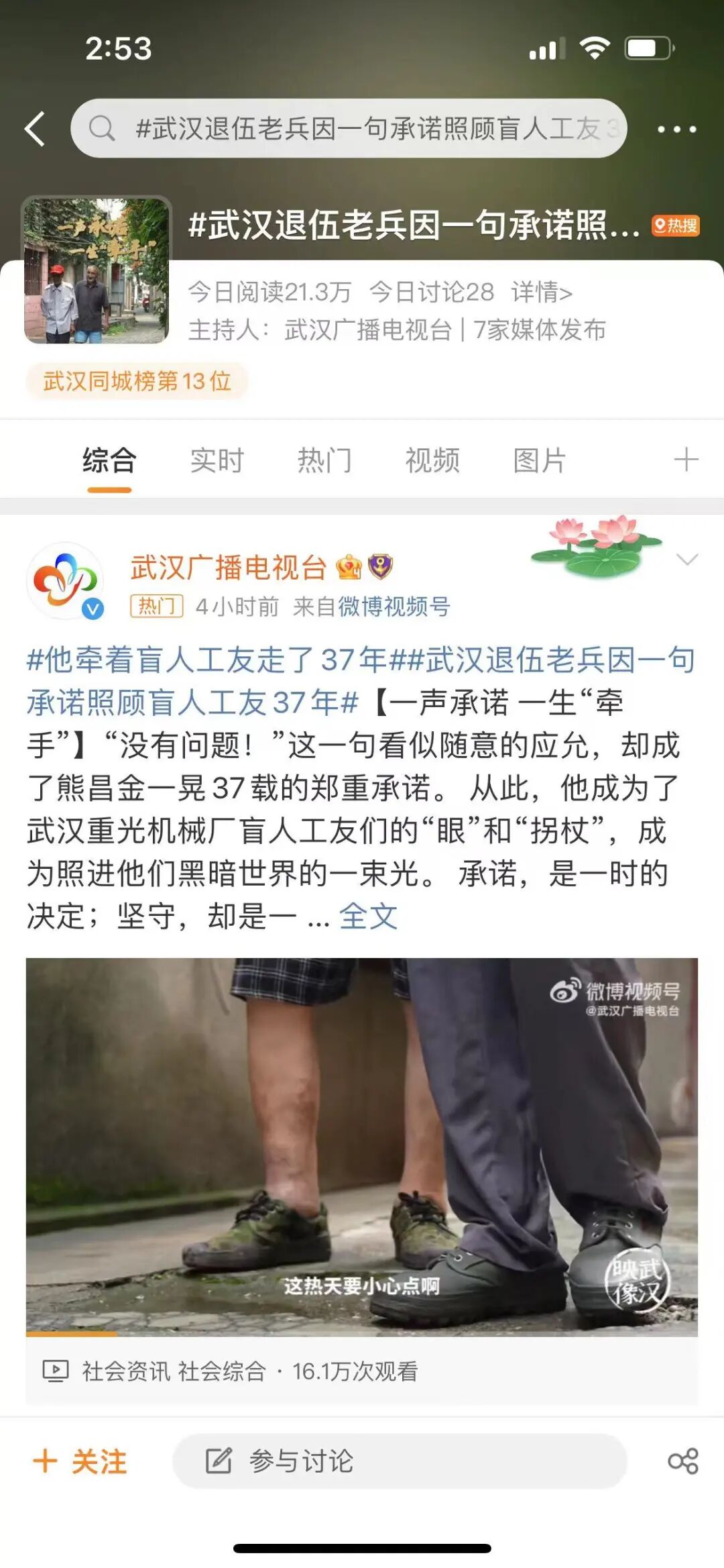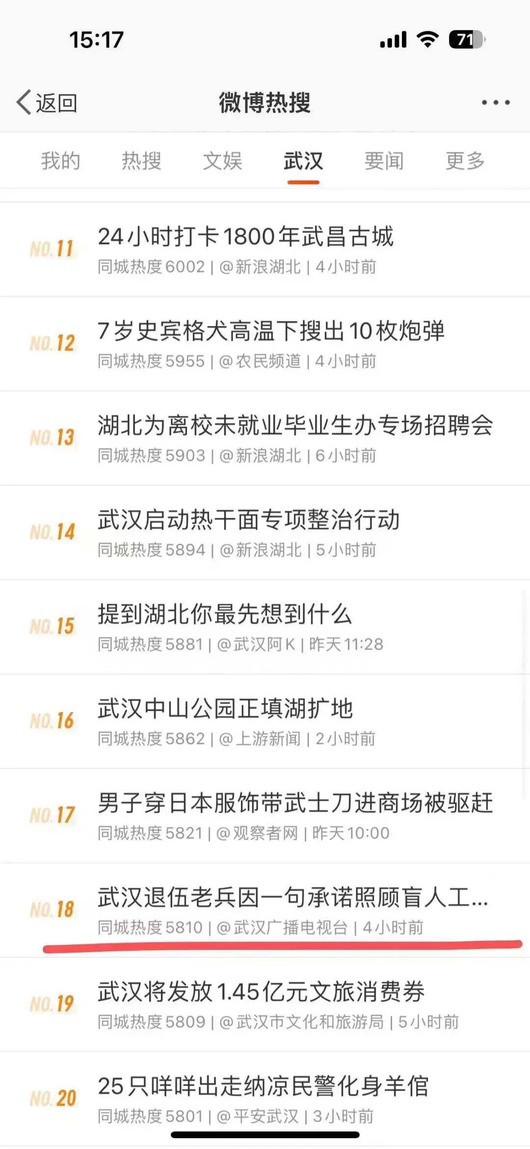8月11日,武汉广播电视台《映像武汉》视频号发布《一声承诺,一生牵手》,被人民日报app首页首屏转载,并登上微博同城热搜。