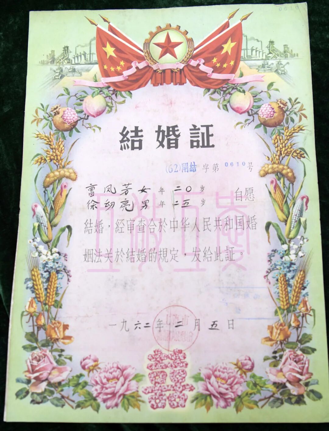 问起相识过程,曹奶奶面含笑意,仿佛回到了和老伴初遇的时候。“他当年是电工,我是广播员,我们都是厂里的文艺积极分子,他吹萨克斯、弹扬琴,我就报幕、唱戏,因爱好兴趣相投两个人就走在了一起。当时我二十几岁,想法很简单,不考虑家庭条件,只要人好老实勤快就行。”结婚时,曹奶奶和徐爷爷在汉口十八号码头乘船前往上海看望亲人,拿着厂里开具的单身证明在沪登记领了结婚证,用五块钱在照相馆拍摄下这张珍贵的婚纱照,用曹奶奶的话讲:“我和你徐爷爷是当时流行的旅行结婚嘞!”