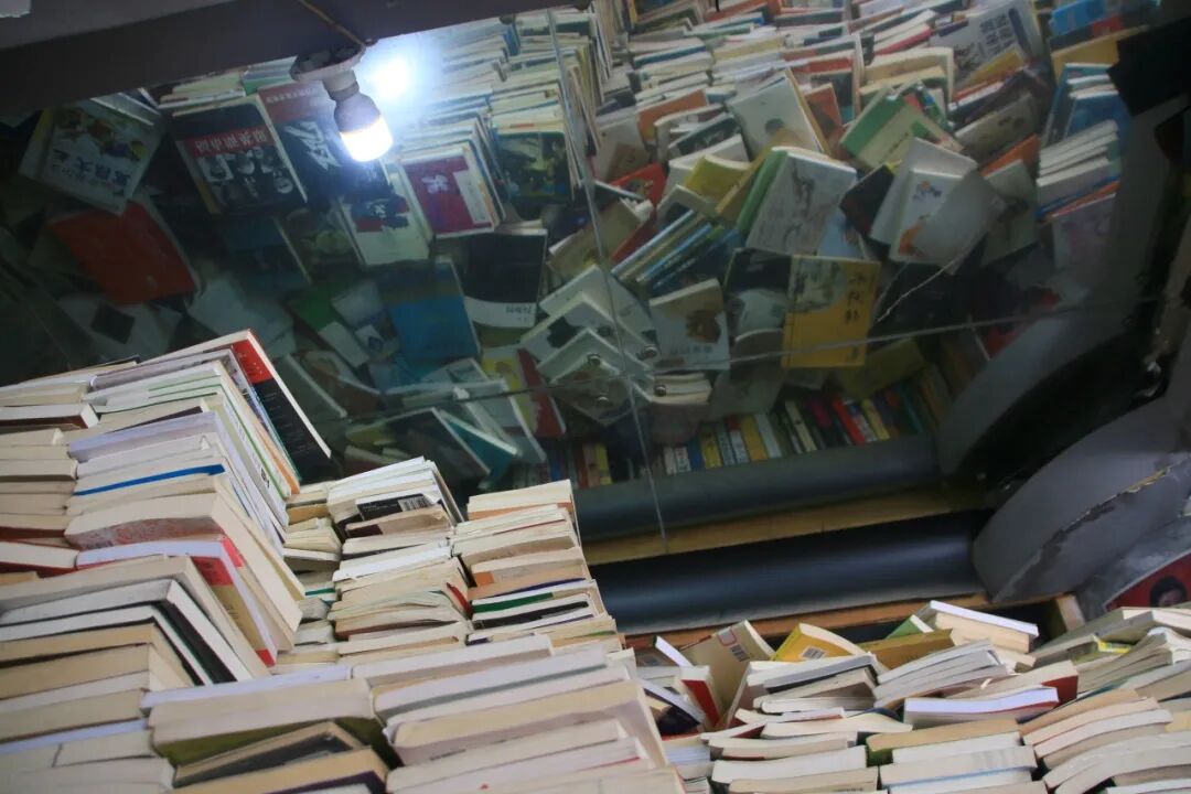 沿着台阶进入书店,通行过道仅容得下一个人,两侧摆满书籍,再往里走,书店内却别有洞天。书柜中泛黄的书籍密密麻麻毫无章法地堆砌在一起,书店老板没有做专门的分类,需要购书者自行翻找。大多数书籍单价在2-5元之间。