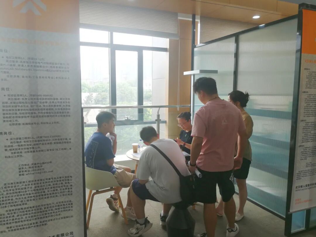 活动现场氛围热烈,各单位展台前围满了前来求职和咨询的各类人才。人才与企业代表面对面精准对接、深入交流,畅谈职业选择与规划。前期深入跟踪服务的武汉海王新能源工程技术有限公司负责人表示,“近年来,公司致力于为我国的核电建设国产化做贡献,业务发展迅猛,用工需求大。这次主要是招纳电仪工程师、检验监造师、压力容器工程师等专业技术人才,年薪6-12万,目前初步面试了7人,后续将安排专业面试,整体情况还不错。”同时,武汉懒人猫数字科技有限公司相关工作人员介绍,“我们前期负责的杭州亚运村以及广东省公安厅的数字靶场属于虚拟数字靶场,还有动画影视业务等,所以此次招聘的岗位有三维动画师、特效师、渲染师和引擎灯光师,整体薪资范围在15~30k。欢迎各位同学前来应聘!”