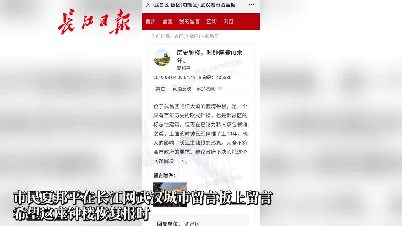 2019年8月4月,网友夏邦平在长江网武汉城市留言板上留言,希望修好位于临江大道蓝湾俊园的这座百年钟楼,与长江对岸的江汉关钟楼形成呼应。
