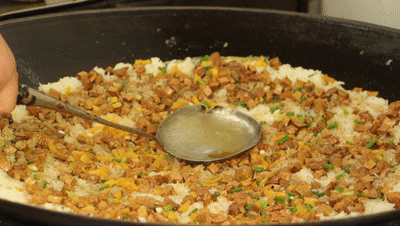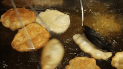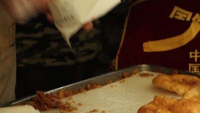 看着别人吃,饿意袭来,我们该找家店去觅食了。沿街糯米包油条、蔡师傅豆皮、老武汉三鲜豆皮、熊太婆水饺、馄饨、糊汤鱼粉……店铺招牌光怪陆离,亮着的灯箱闪闪。我们一一掠过,直奔家阳赵师傅油饼包烧卖。哟,赵师傅的店面,已排起了长长的队伍。真不愧是家网红店,还有专门的售票处。排队总有二三十分钟,才轮到我们。油饼和烧卖,原本都有,只不过是两样食品。现在这种“油饼包烧卖”的吃法,是近年才出现的早点创新。只见师傅们用碱水和面,在和好的面团里加入少许盐,放入油锅炸,炸至鼓起来,金黄焦脆。油饼中间是空心的,正好方便包入烧卖。烧卖则是用蒸熟的糯米拌入炒好的五花肉、香菇丁等,加入少许高汤、大量胡椒粉而成。我们拿着油饼包烧卖,满满一口下去,既有油饼的焦脆,又有烧卖的软糯。真是饼馅交融,两种食物完美结合,完全颠覆了我的味蕾。吃了出来,外面的人越排越多,过早的高峰到啦。