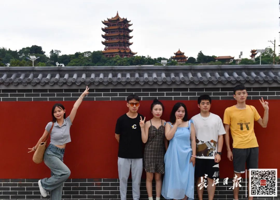 ▲暑假,地铁5号线司门口黄鹤楼站,游客在灰瓦红墙前与不远处的黄鹤楼合影留念。记者李永刚 摄