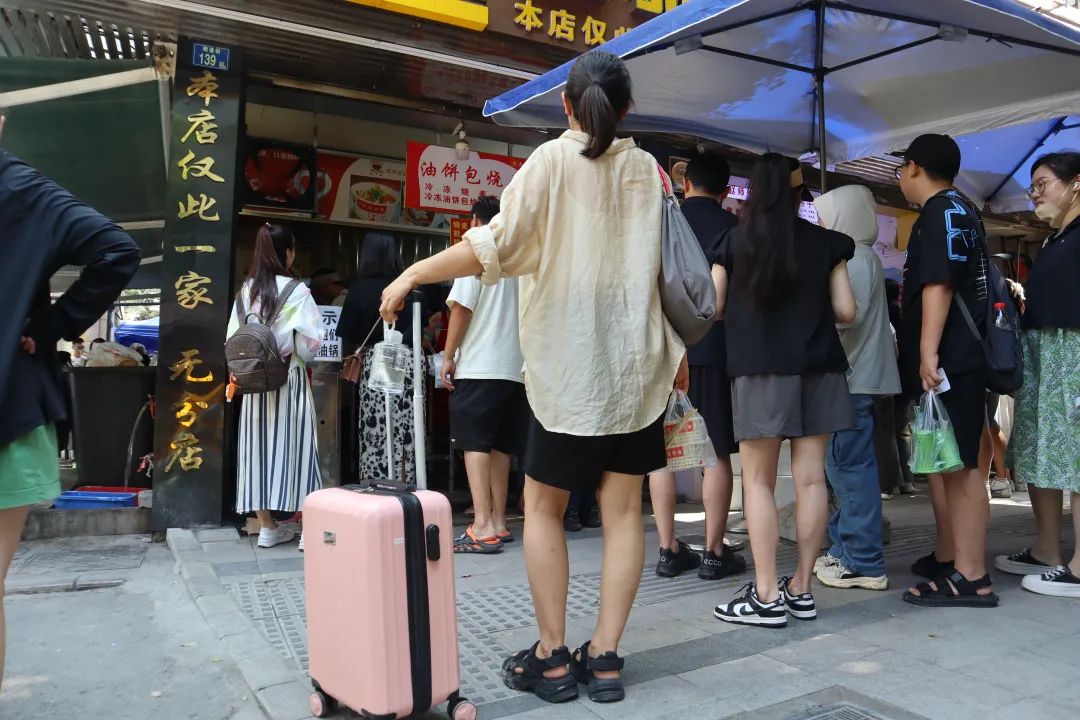 ▲赵师傅油饼包烧麦店,外地游客拖着行李箱排队。长江日报资料图