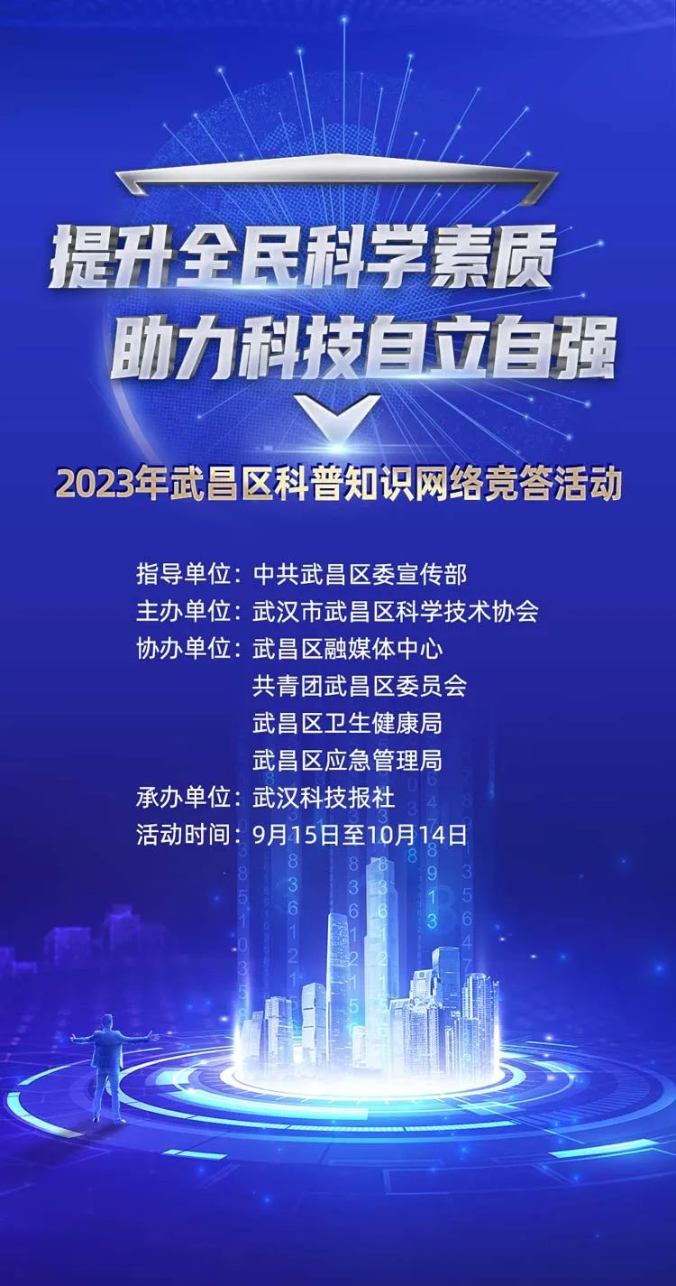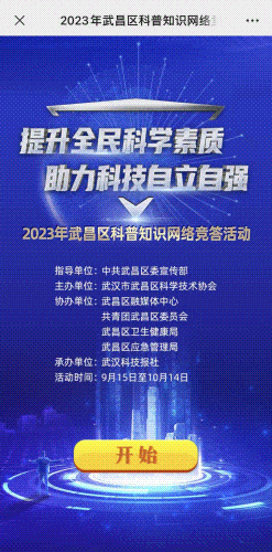 为深入学习贯彻党的二十大精神,贯彻落实《关于新时代进一步加强科学技术普及工作的意见》《全民科学素质行动规划纲要(2021—2035年)》,落实科技创新与科学普及同等重要的论述精神,助推武昌区科技创新高质量发展,武昌区科协拟开展2023年武昌区科普知识网络竞答活动。