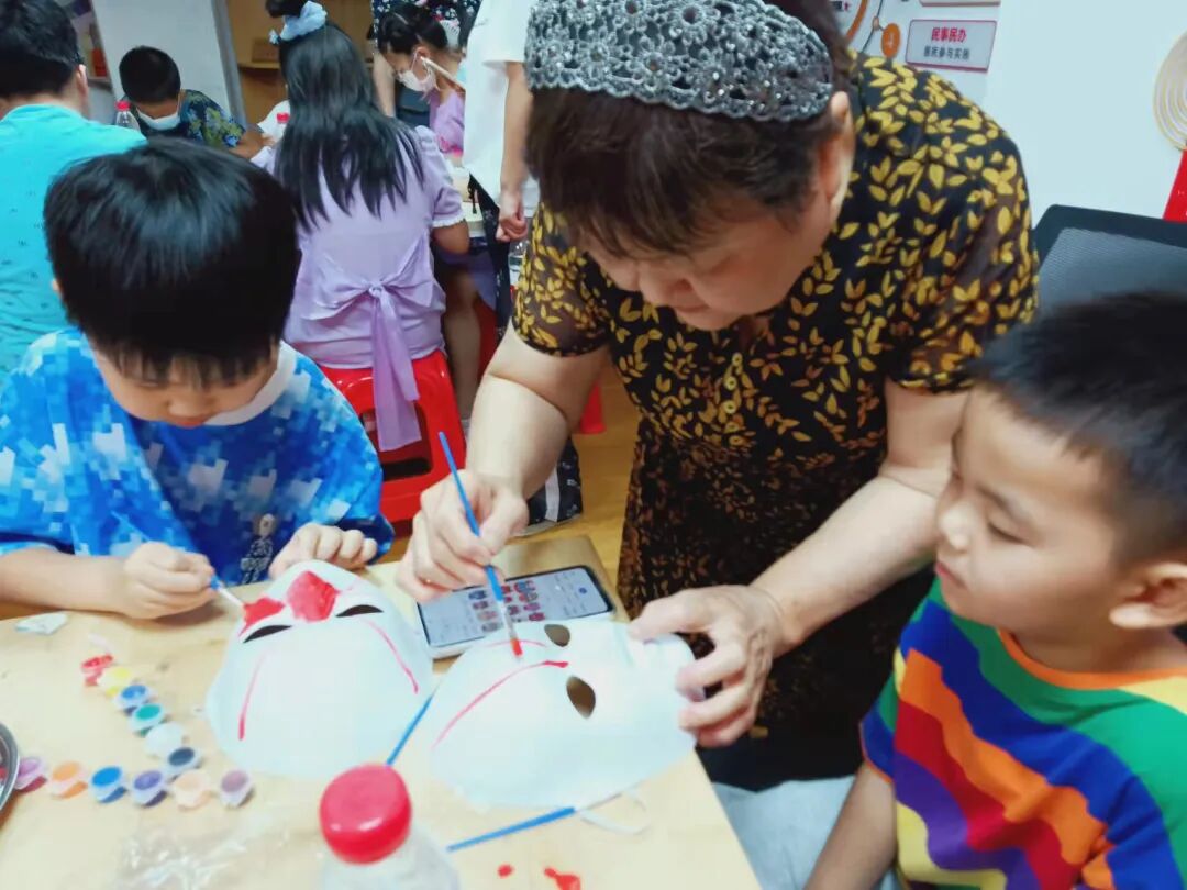 ▲社区京剧爱好者指导小朋友画京剧脸谱
