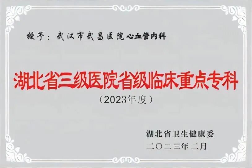 心血管内科是湖北省临床重点专科,设有全省首个“胡大一名医工作室”,先后通过中国胸痛中心、中国心衰中心、国家标准化心脏康复中心、CDQI国家标准化心血管与代谢疾病中心、湖北省急性心血管疾病救治分中心、湖北省房颤中心联盟单位认证。