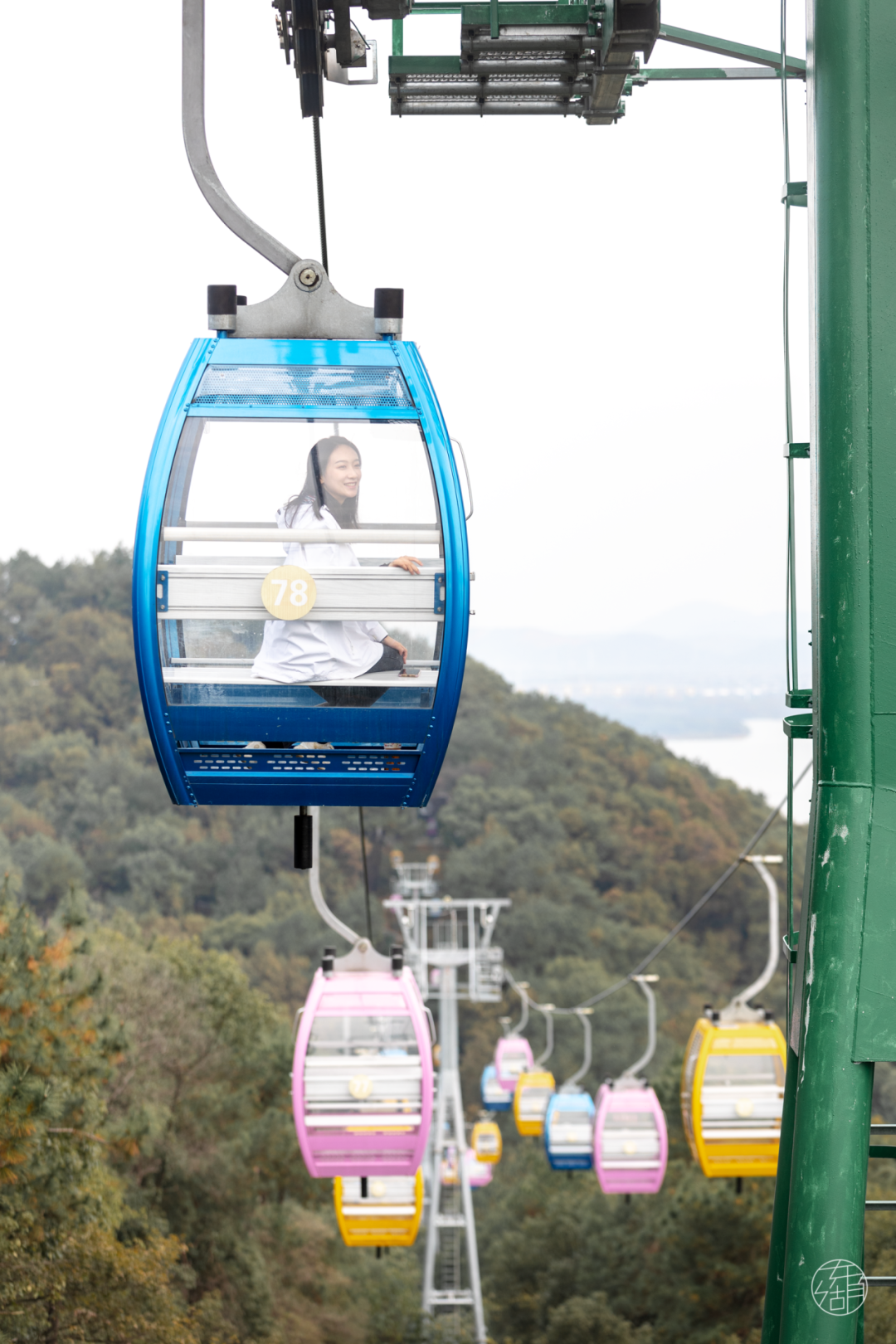 下午,坐上马卡龙色的磨山缆车,在空中悠悠地欣赏东湖全景,打卡电影同款千帆亭。