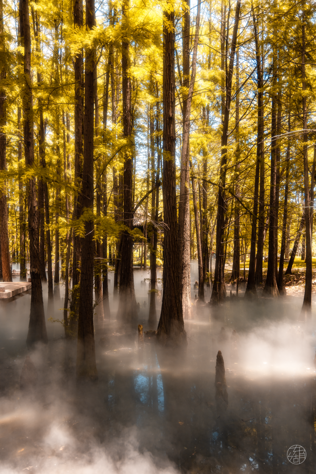 九曲桥的雾气升腾超级出片,雁洲索桥下的竹筏是经典机位,几乎每走一步都是拍照打卡的出片地。