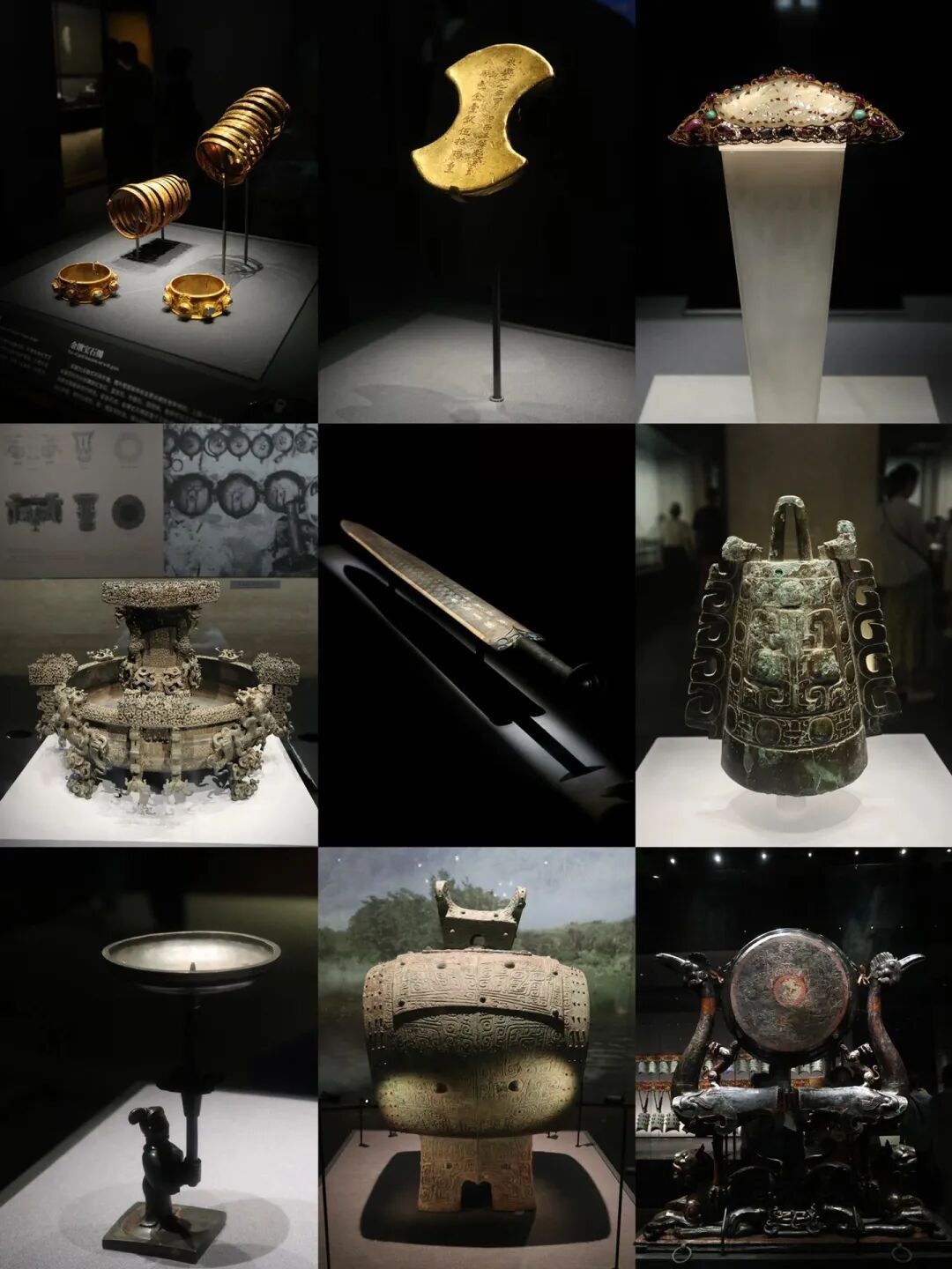 1978年出土于“曾侯乙墓”的曾侯乙编钟、中国冷兵器时代的精品之作越王勾践剑、距今约100万年的郧县人头骨化石、元青花四爱图梅瓶。