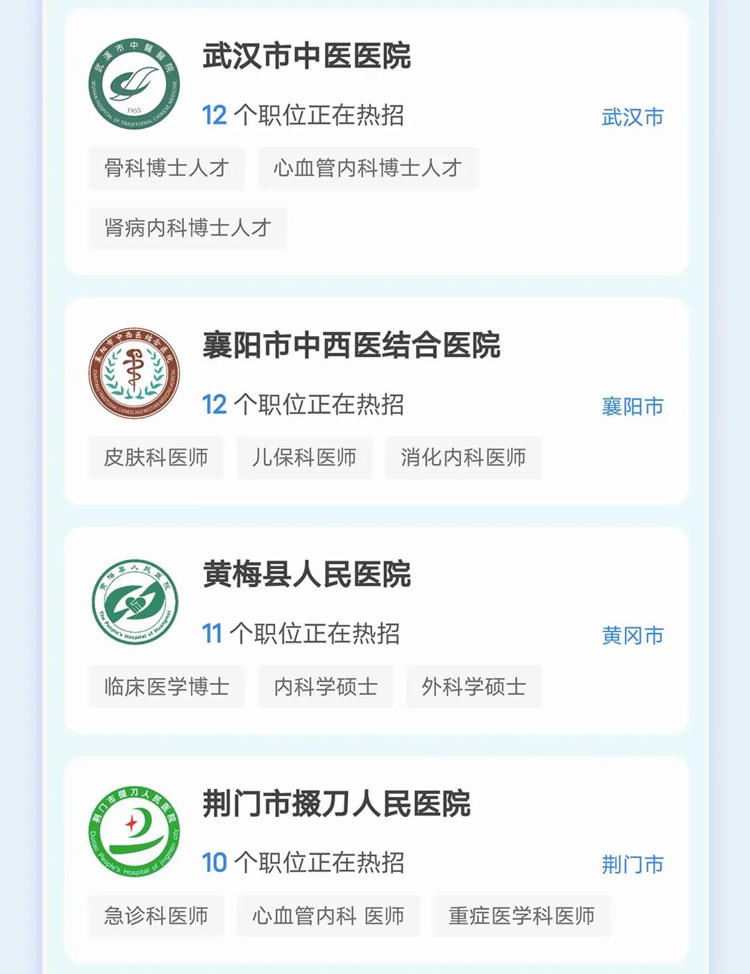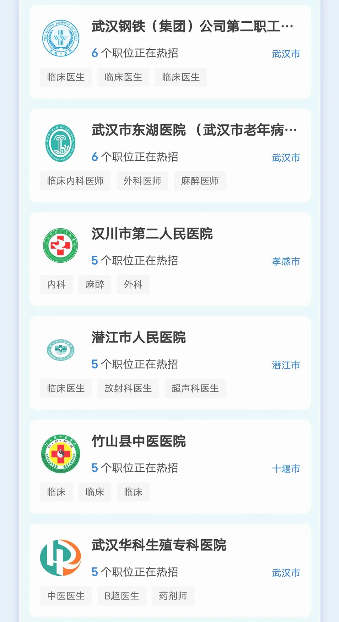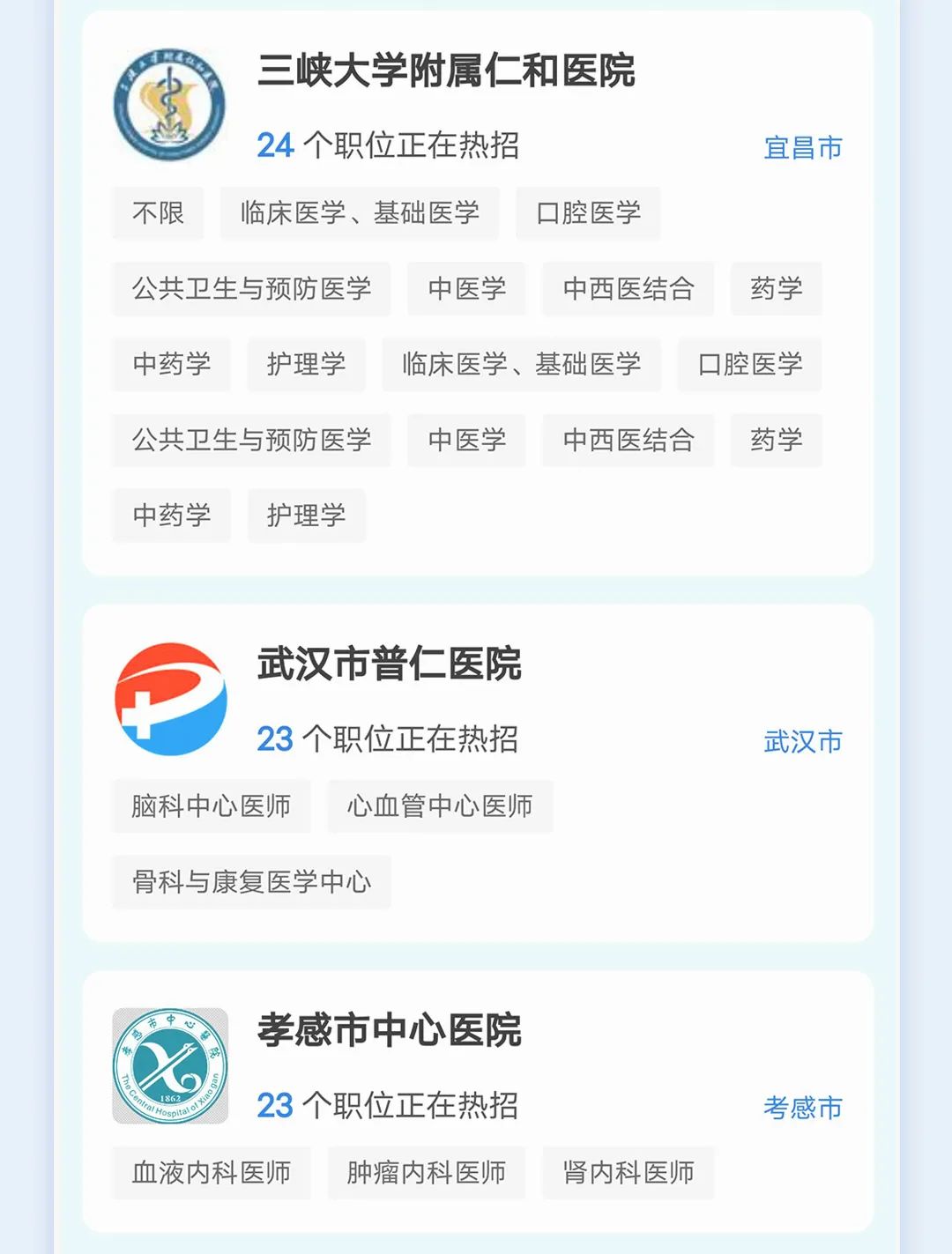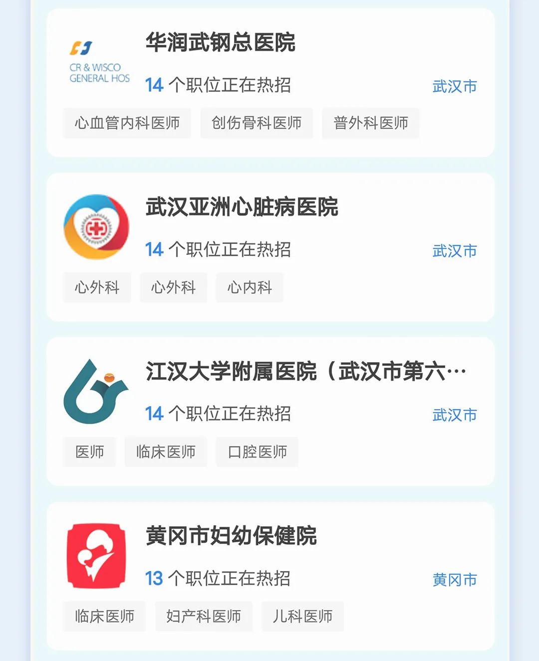 本场招聘会单位以省内医疗单位为主,包含湖北省妇幼保健院、湖北省中医院、湖北省肿瘤医院、武汉市中心医院、武汉市第一医院、武汉市第四医院、武汉市第三医院、武汉儿童医院、襄阳市中心医院、宜昌市中心医院、十堰市太和医院等众多知名三甲医院。同时,江苏、浙江也组建豪华招聘阵容,江苏省人民医院、江苏省肿瘤医院、苏州大学附属第一医院、苏州大学附属儿童医院、浙江大学医学院附属邵逸夫医院、温州医科大学附属第一医院等40余家知名单位也将携大量招聘岗位赴武汉开展引才工作。