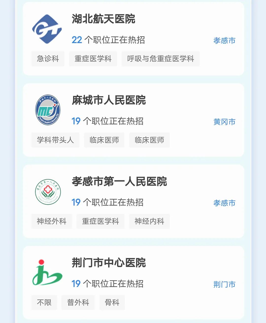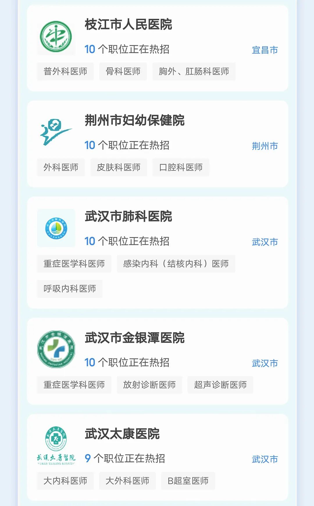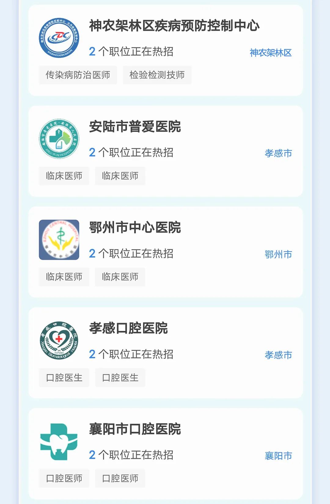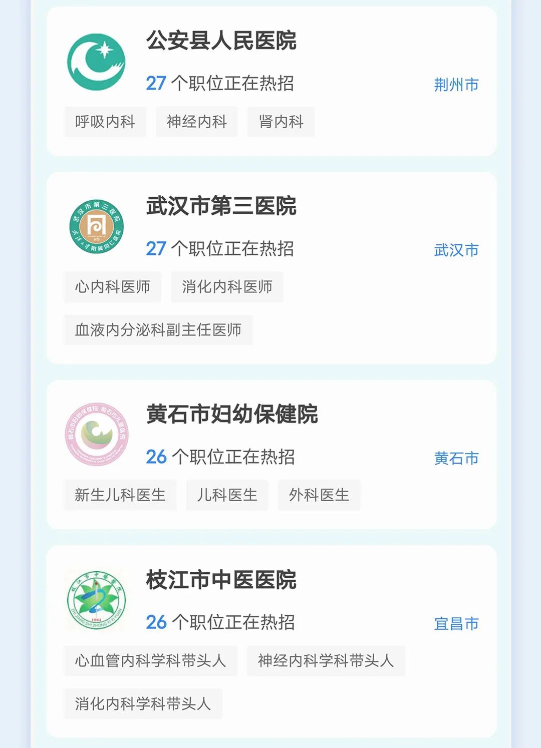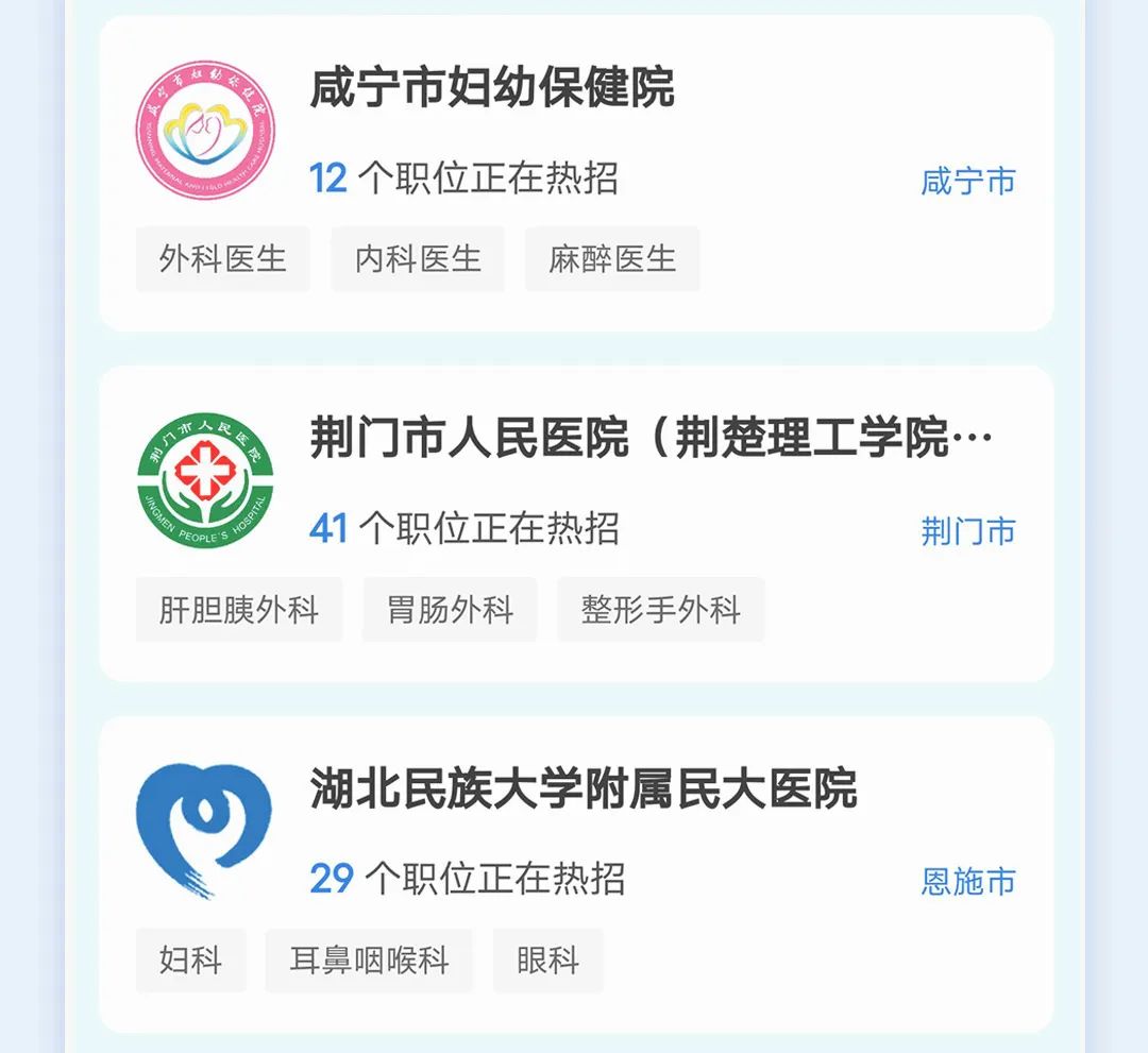 本场招聘会单位以省内医疗单位为主,包含湖北省妇幼保健院、湖北省中医院、湖北省肿瘤医院、武汉市中心医院、武汉市第一医院、武汉市第四医院、武汉市第三医院、武汉儿童医院、襄阳市中心医院、宜昌市中心医院、十堰市太和医院等众多知名三甲医院。同时,江苏、浙江也组建豪华招聘阵容,江苏省人民医院、江苏省肿瘤医院、苏州大学附属第一医院、苏州大学附属儿童医院、浙江大学医学院附属邵逸夫医院、温州医科大学附属第一医院等40余家知名单位也将携大量招聘岗位赴武汉开展引才工作。