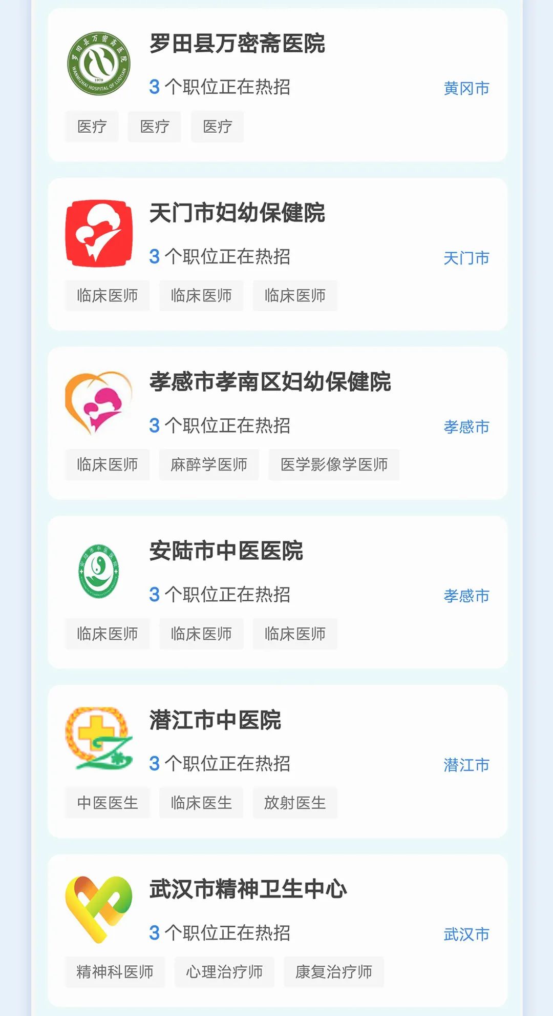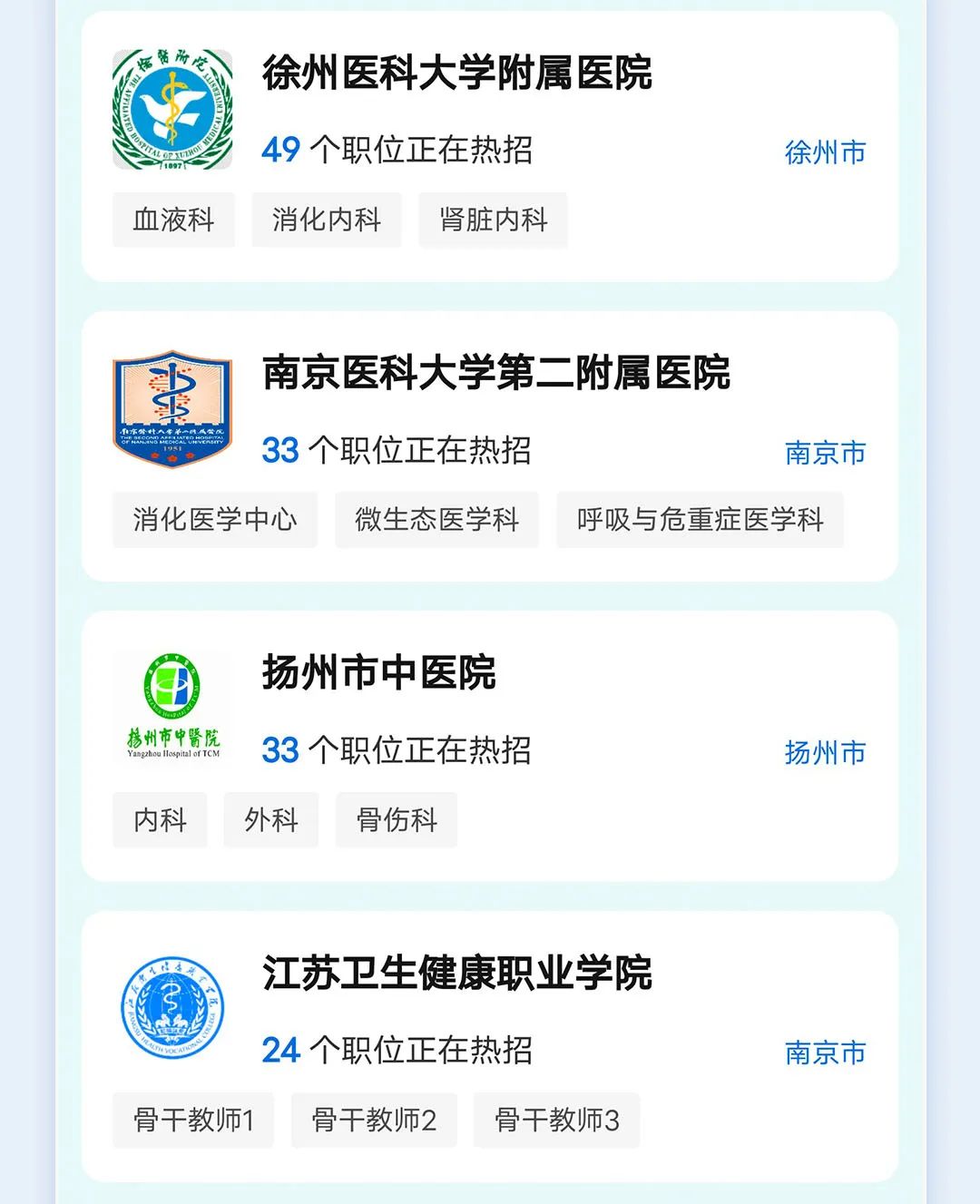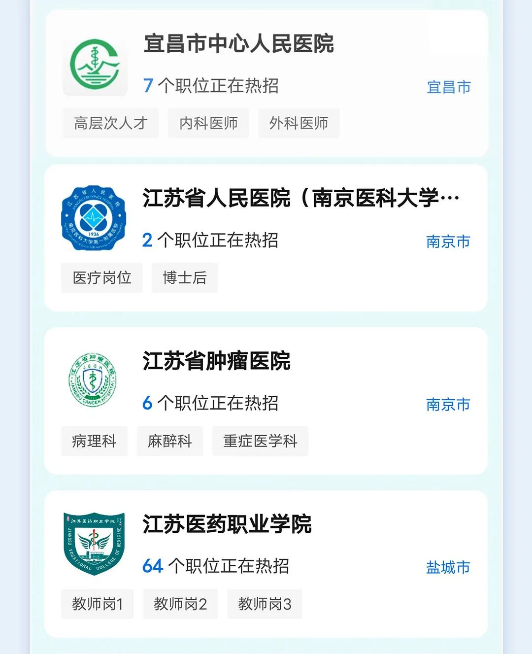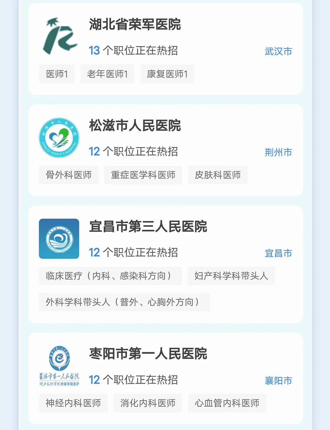 本场招聘会单位以省内医疗单位为主,包含湖北省妇幼保健院、湖北省中医院、湖北省肿瘤医院、武汉市中心医院、武汉市第一医院、武汉市第四医院、武汉市第三医院、武汉儿童医院、襄阳市中心医院、宜昌市中心医院、十堰市太和医院等众多知名三甲医院。同时,江苏、浙江也组建豪华招聘阵容,江苏省人民医院、江苏省肿瘤医院、苏州大学附属第一医院、苏州大学附属儿童医院、浙江大学医学院附属邵逸夫医院、温州医科大学附属第一医院等40余家知名单位也将携大量招聘岗位赴武汉开展引才工作。