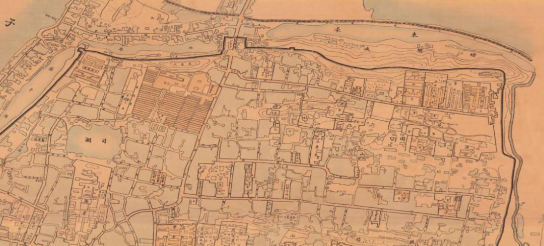 我们可参照1909年昙华林街区图来看看。1909年为清宣统元年,距科举被废才4年,武昌贡院内考务办公用房及考试用房已部分用作新式学校,但其围墙未拆,整个外部轮廓变化甚微。如图所示,武昌贡院赫然为武昌城内占地面积最大的建筑群,其围墙四至非常清晰:北依凤凰山,东至武胜门正街(今得胜桥),西接县儒学(今解放路与其西侧狭长地带),南接东、西卷棚街(今火炬路),东、西卷棚街之间有一小块向南凸出的不规则长方形区域,并有出口连接贡院前街(今楚材街)。将图放大仔细看,贡院南侧“商农业学堂”东南角有一处向北微凸的“八”字形,通过南边左右对称的两楹房屋中间通道对着贡院前街。此“八”字处就是贡院龙门(正门),与今天正对楚材街的“省实验”大门在同一位置。