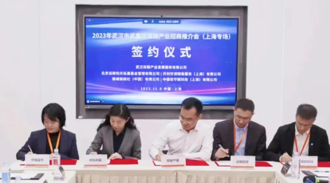 推介会上,武昌再添“新朋友”,武汉双碳产业发展服务有限公司同北京远致钧天私募基金管理有限公司、开利空调销售服务(上海)有限公司、挪威船级社、中福信守碳科技(上海)有限公司现场达成合作签约。