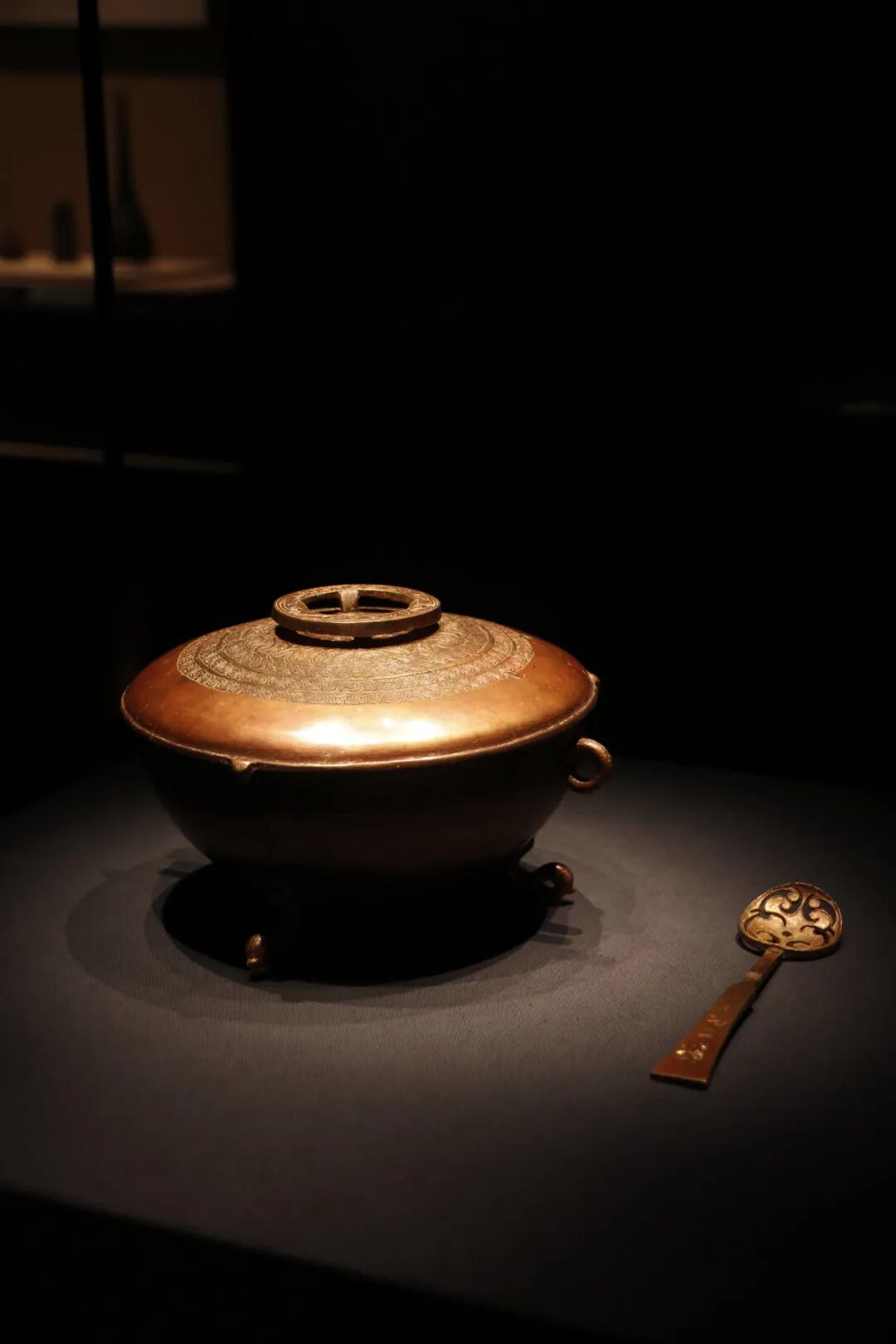 「金盏」装饰着蟠螭纹、陶纹和云雷纹,三足作倒置的凤首,纹饰和器形都很美观。出土时,它的身边还伴随着金镂空漏匕一件。