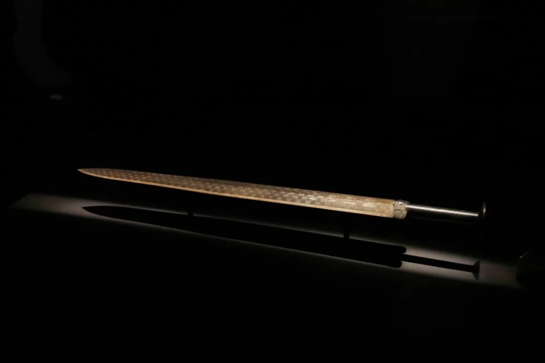 剑格正面镶有蓝色琉璃,背面镶有绿松石,剑身上布满了规则的黑色菱形暗格花纹。