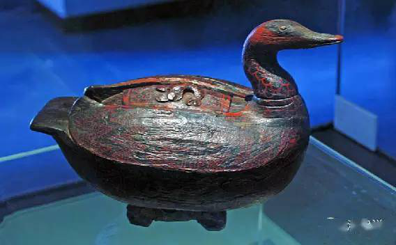 「彩漆木雕鸳鸯形盒」是战国时期的“萌宠”,这件盒子的头部与身体以榫卯结构相接,头部可以360度旋转,通体黑漆为底,遍身施以彩绘。
