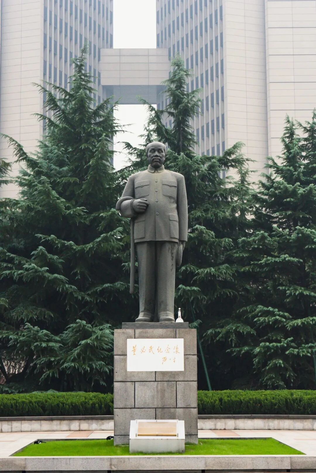 洪山广场始建于1991年,当时为缅怀老一辈革命家董必武诞辰105周年而修建的一座纪念性广场,先后经历了四次改造阶段。董必武铜像高4米,坐落于广场东侧,正面有邓小平同志题写的“董必武纪念像”,背面则为董必武生平,纪念台周围56个雕花栏象征56个民族,铜像背后105株雪松,寓意铜像树立时董老诞辰105周年。