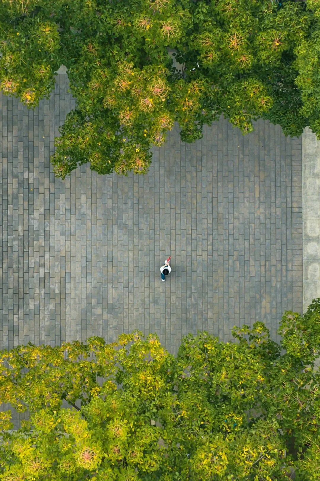 在洪山广场的休闲林荫广场,你可以和家人漫步休闲、健身跳舞,也可以和好友赏花骑行。休闲林荫广场由树阵、雾森、镜面水景等主要元素组成。