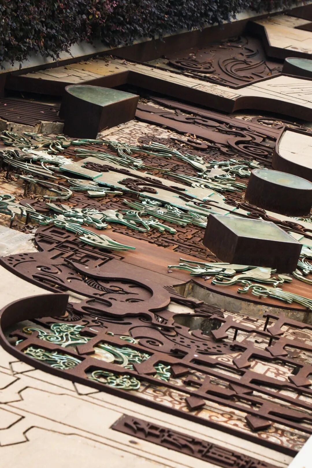 广场中央铺装了花岗石“火凤凰”和5块大型浮雕,500多株高大乔木在广场四周形成绿化环绕带。