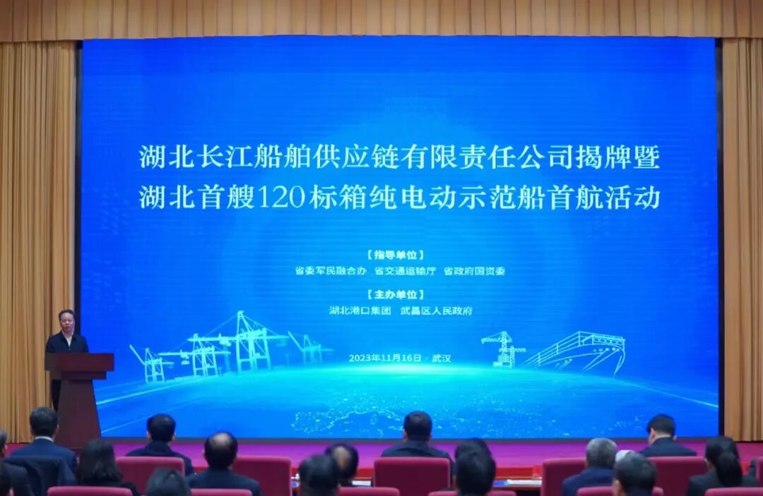 11月16日,湖北长江船舶供应链有限责任公司揭牌暨湖北首艘120标箱纯电动示范船首航活动在武昌区举办。