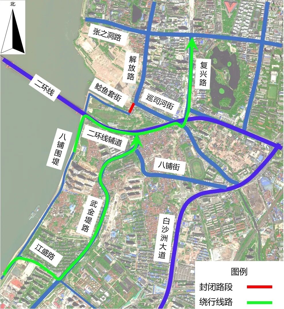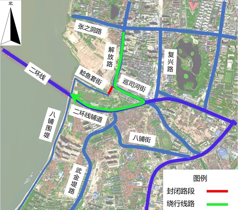 1、原北向南通行解放路的车辆到八辅围堤方向的车辆,可绕行巡司河街-二环线辅道-八辅围堤。