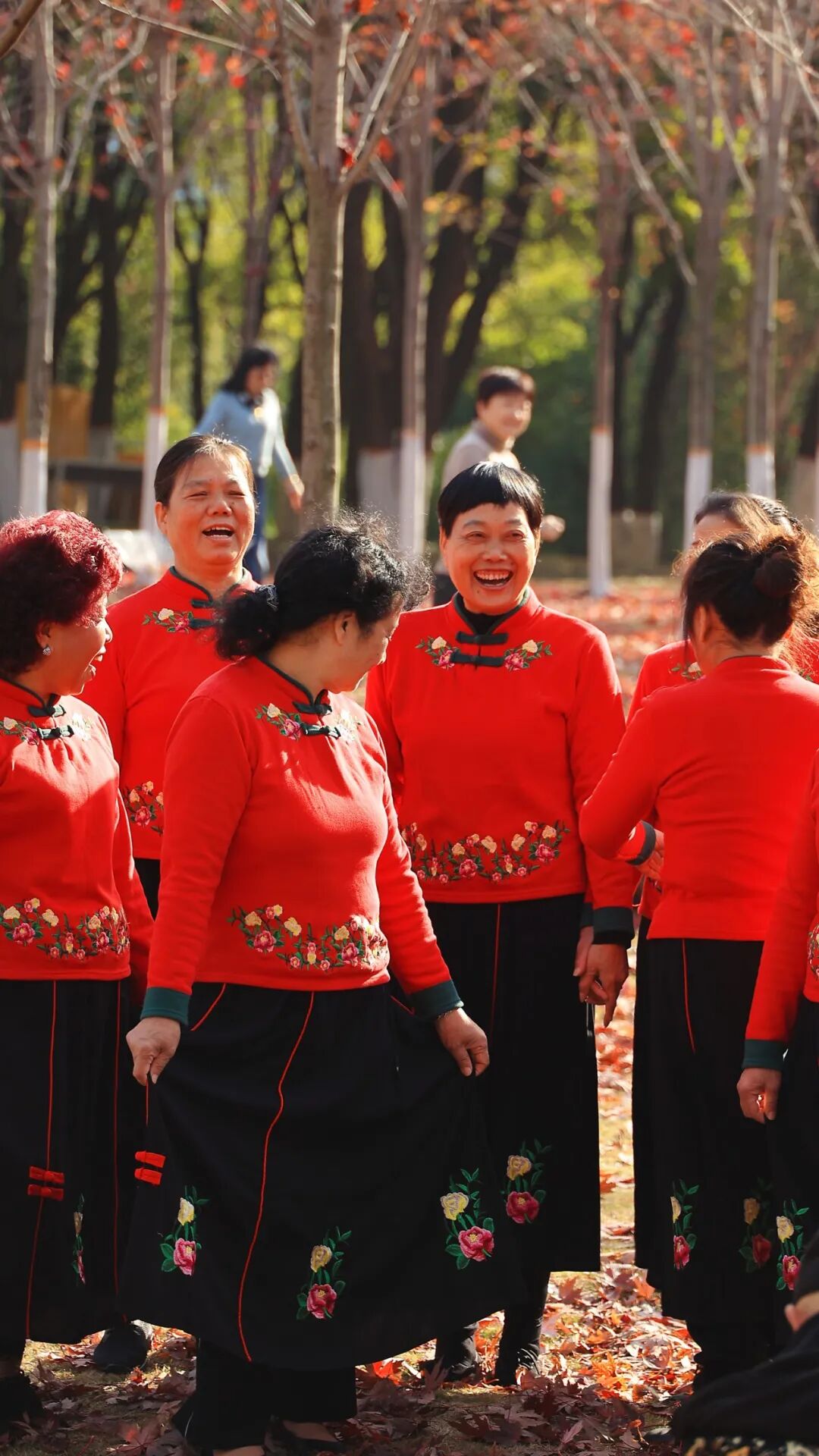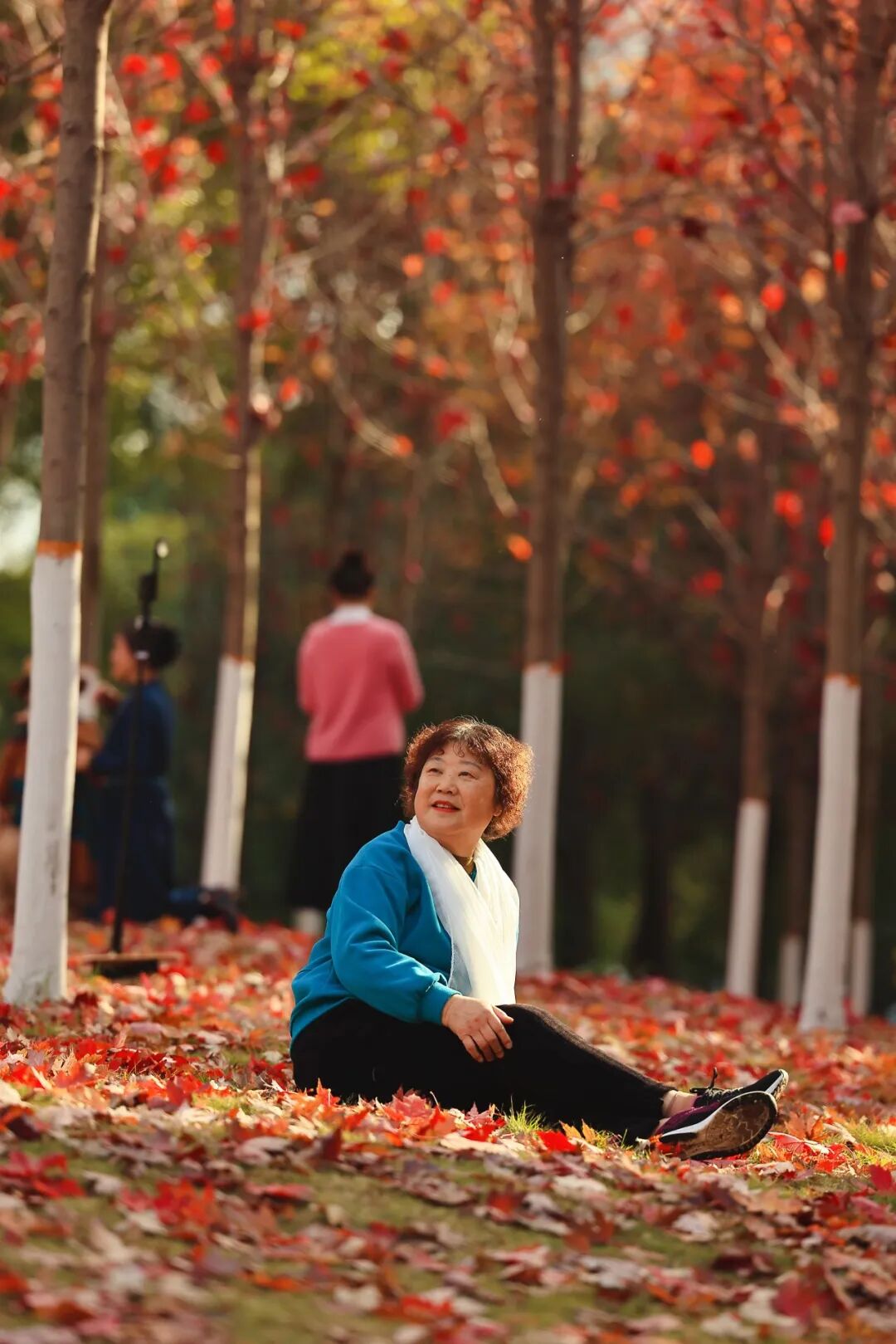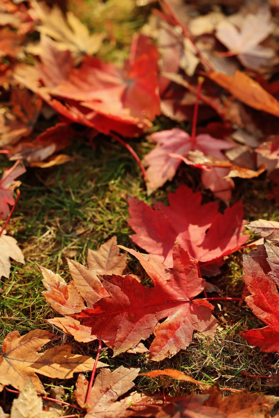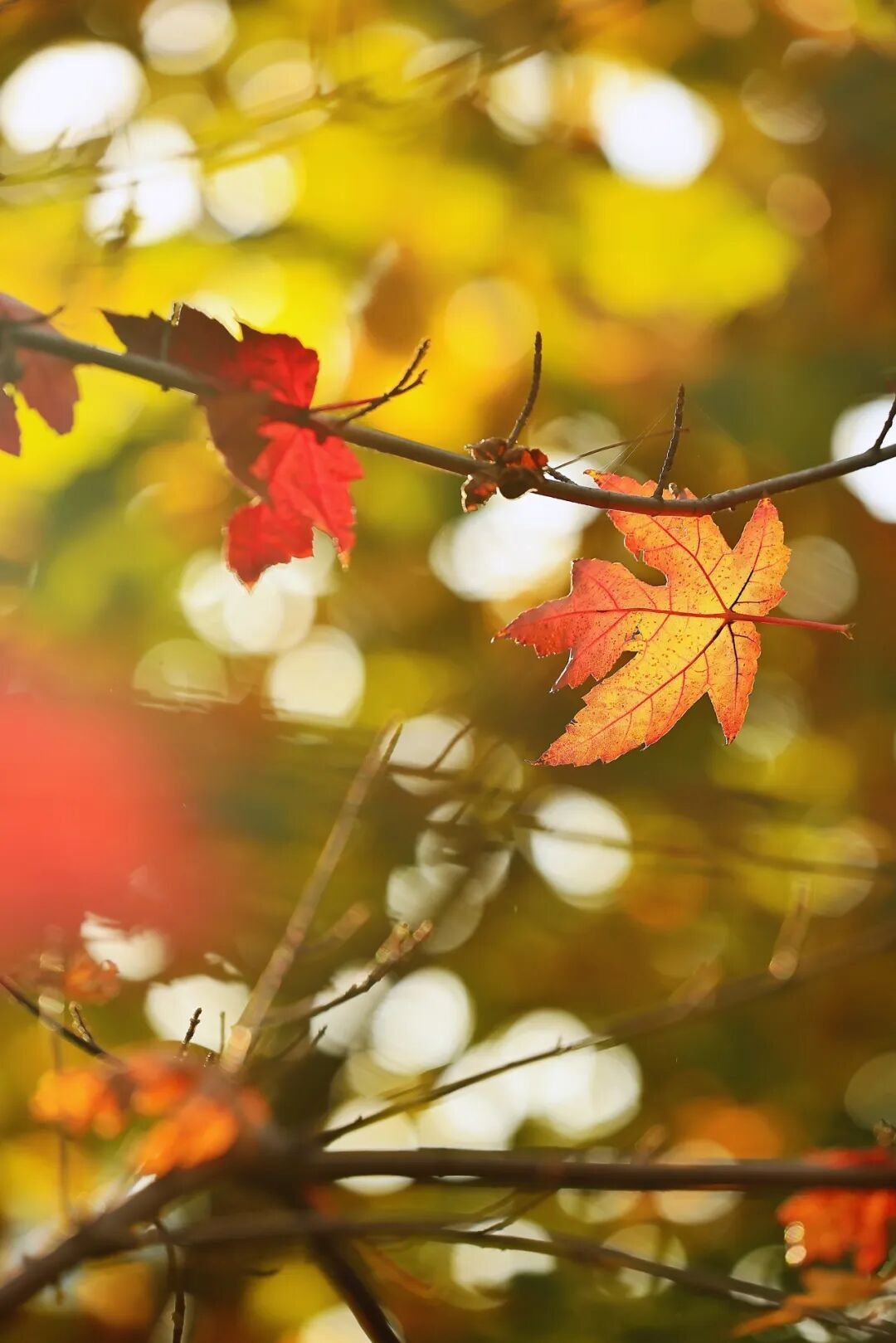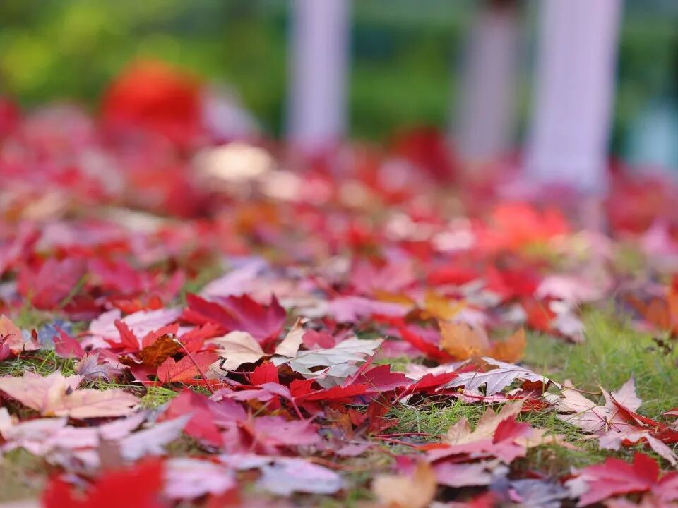 远方的黄绿植被与色彩斑澜的枫叶相映成趣。