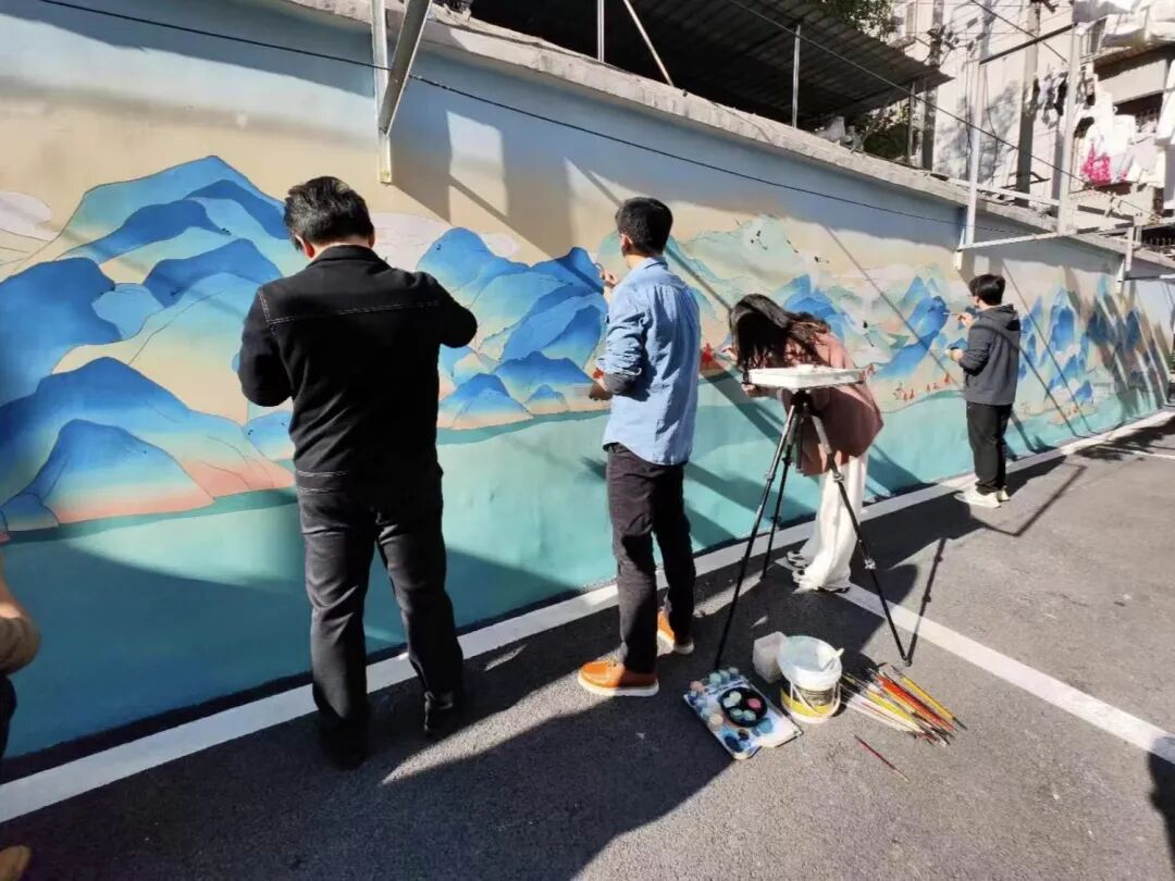 描摹的描摹、上色的上色、勾勒的勾勒……在湖北省美术院中国画创研室主任柳秀林的带领下,7名湖北省美术院的专业艺术家们在小区院墙前各司其职。付出就会有收获,随着画笔在空墙上一笔笔地落下,原本的苍白被彩色渐渐填满、曾经的单调被缤纷逐步覆盖,主题为“只此青绿”的青山绿水国潮水墨画在短短10天时间内亮相,让小区院墙来了个大变样。