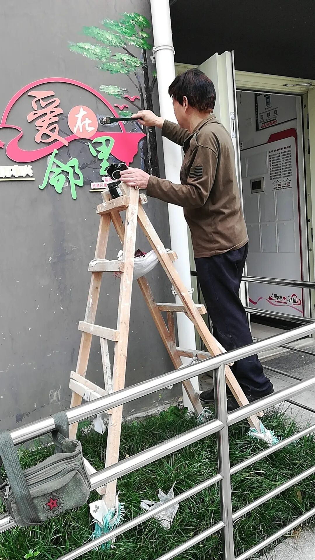 ▲社区书画班张绍祥老师自发对氛围墙进行修补
