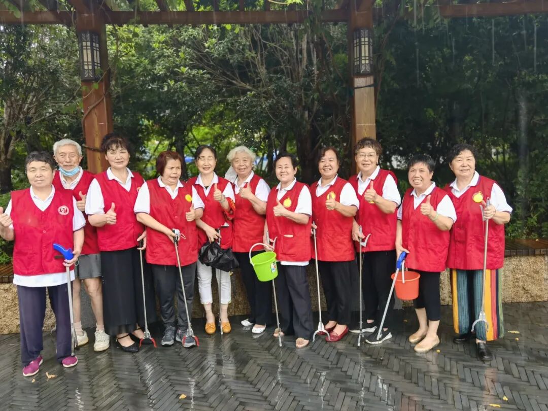 ▲南湖大妈志愿者参与清洁家园活动