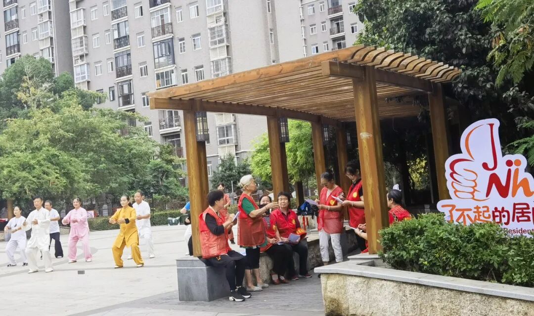 都市桃源社区的“南湖大妈”志愿者团队,别看她们年纪大,社区里里外外的事都愿意管上一管。2023年社区志愿者饶冠琼为“南湖大妈”设计的团队新LOGO票选产生了,整体造型由“呵护的双手”“舞动的人”和“爱心”组成。“呵护的双手”体现了南湖大妈双手维护社区,是社区治理的好帮手;“舞动的人”则象征着南湖大妈的积极与活跃;人物挥舞着的红绫组成了“爱心”,表达了南湖大妈无私奉献的爱心和与社区共创美好家园的心意。