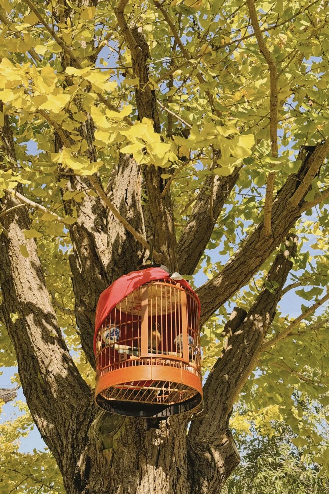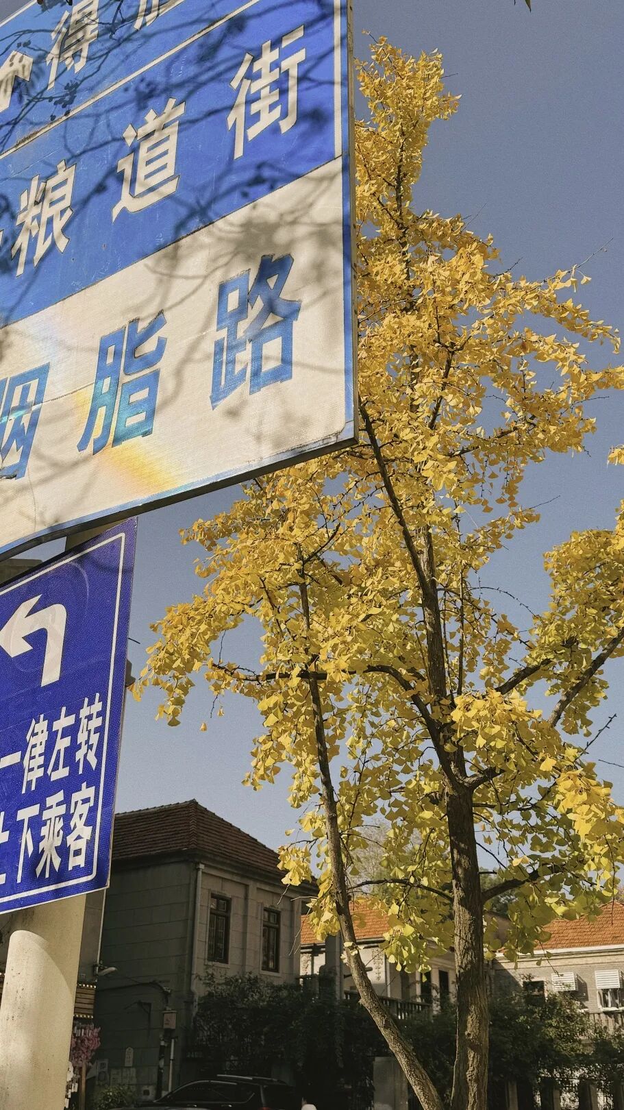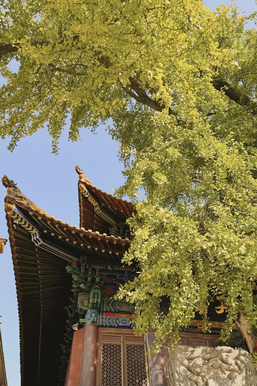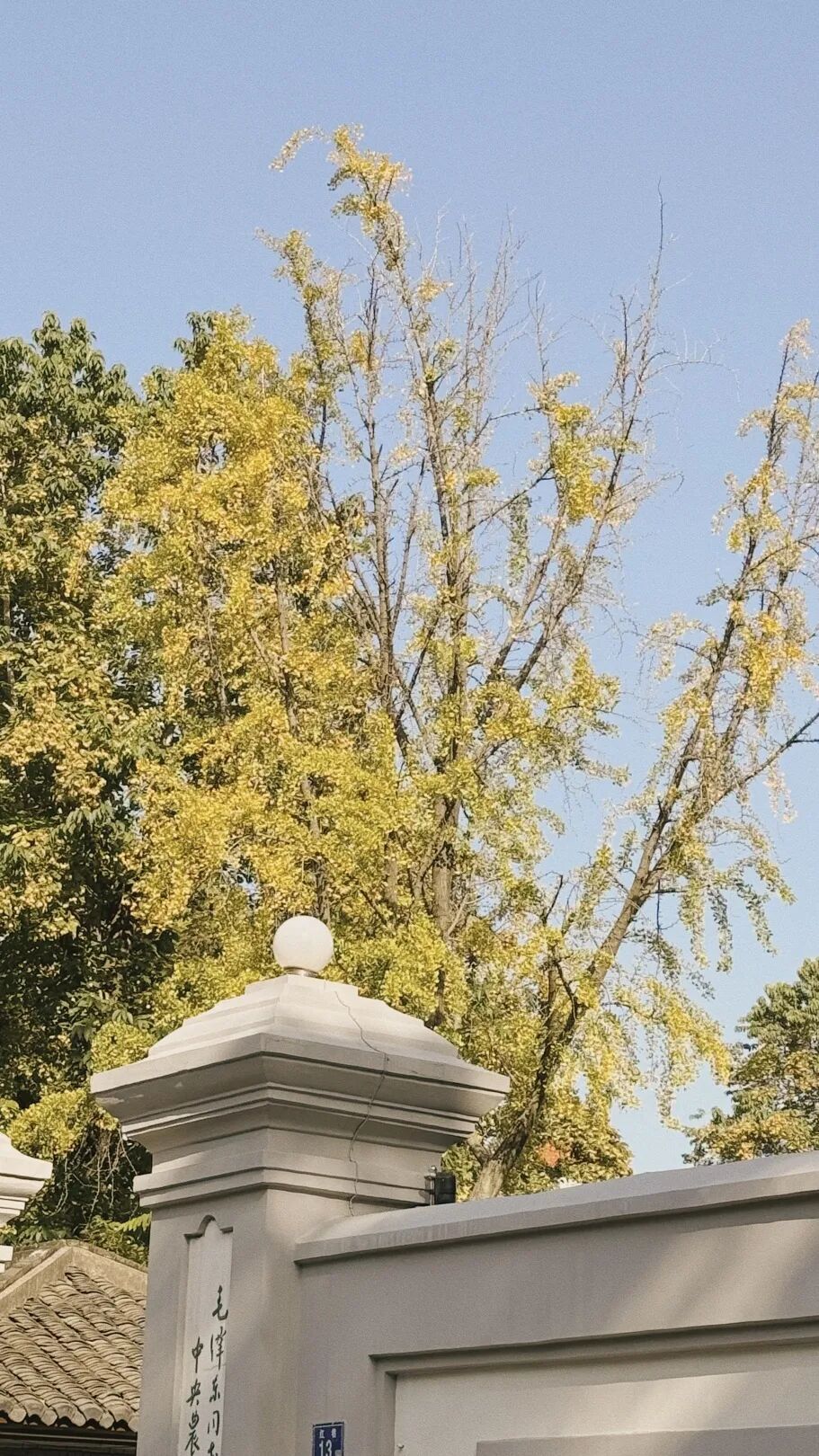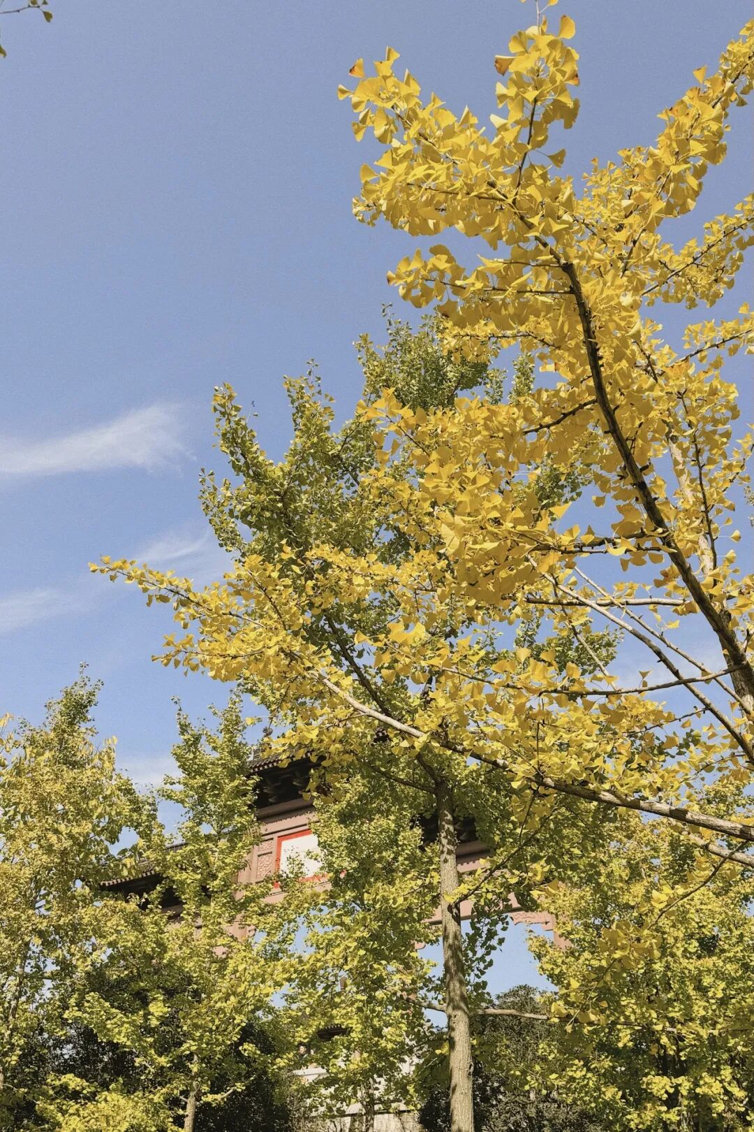 微风轻拂,银杏叶似蝶翩翩飞舞,轻飘在石阶、瓦楞上,放眼望去一树灿烂、满地金黄,顷刻间便将秋冬的韵味渲染到极致。