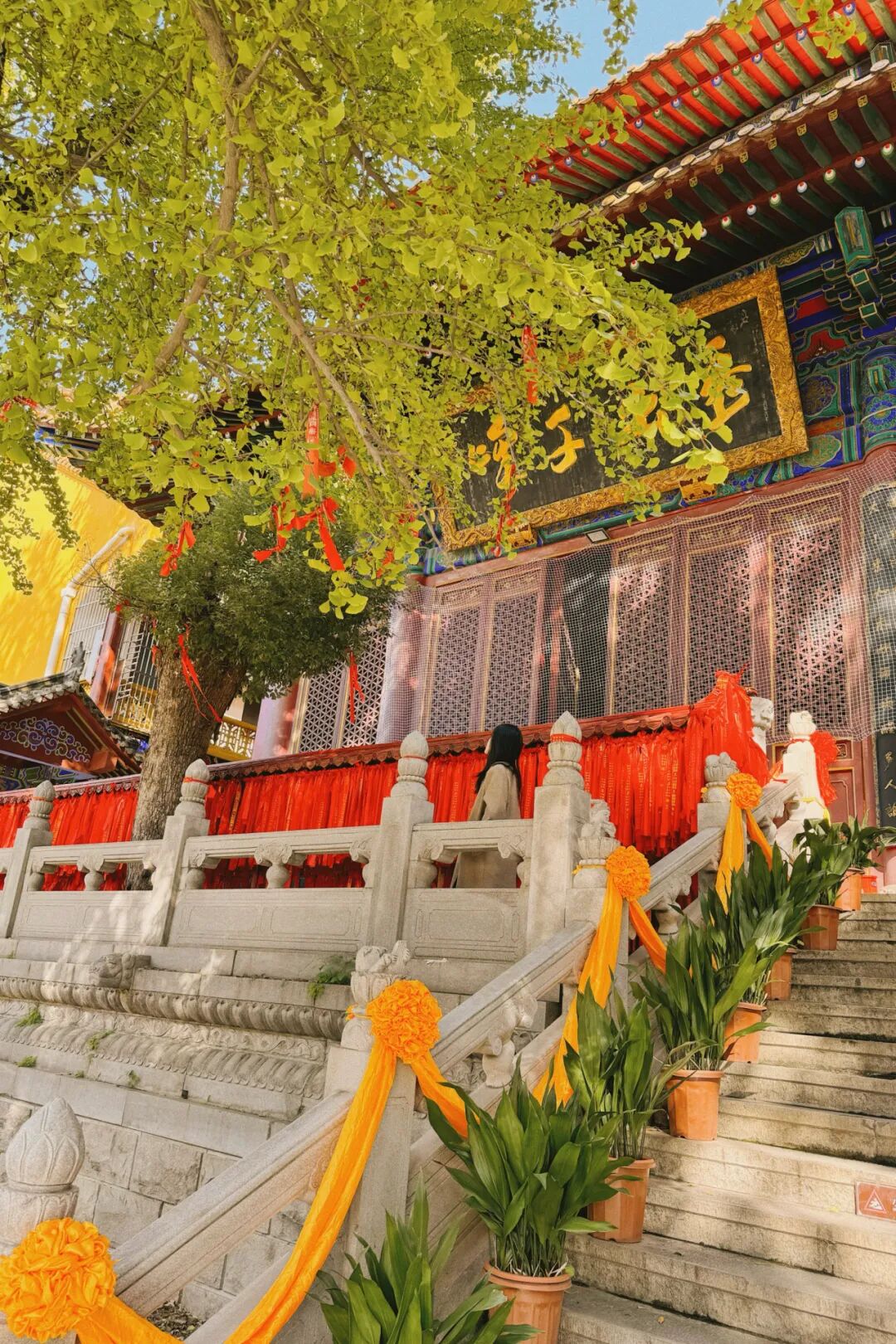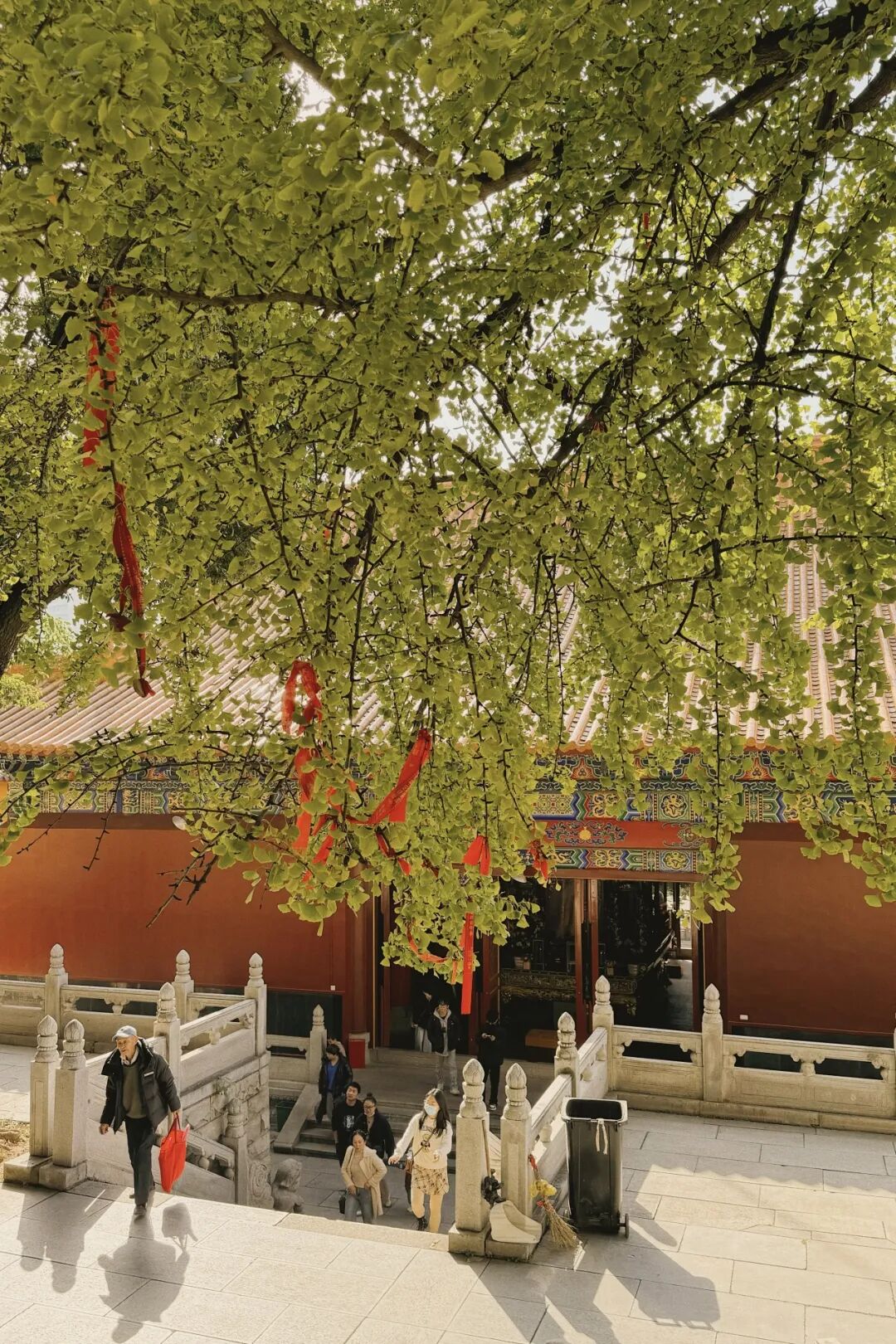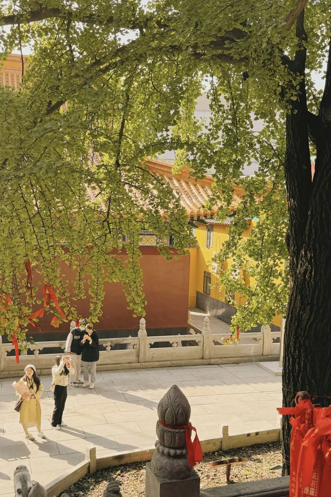 栅栏上系满了红色的祈福带,和黄色的银杏相映成趣。