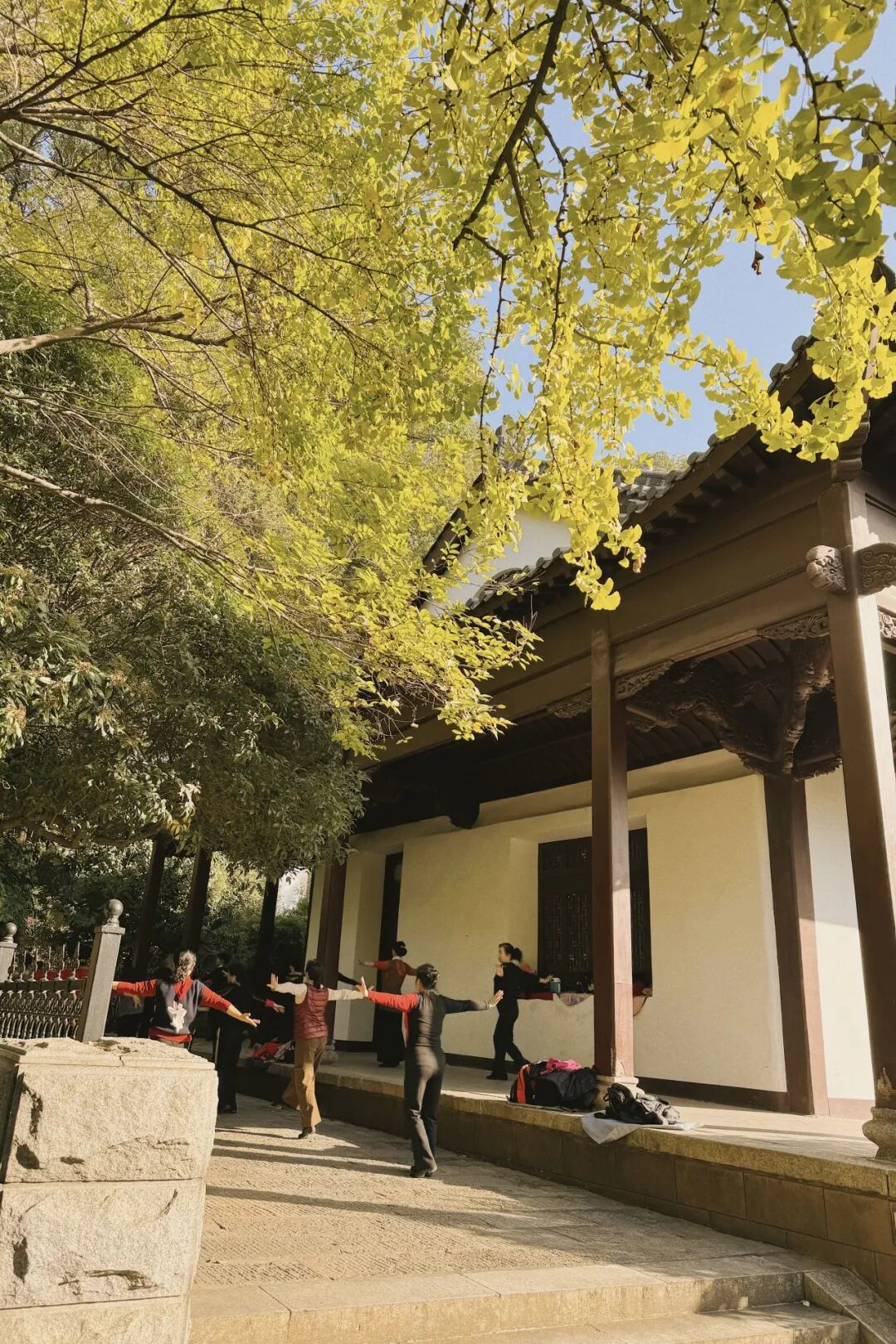 抱冰堂前还有阿姨们在跳民族舞,因为银杏树的加入舞蹈仿佛也增添了浪漫色彩,有岁月静好之感。