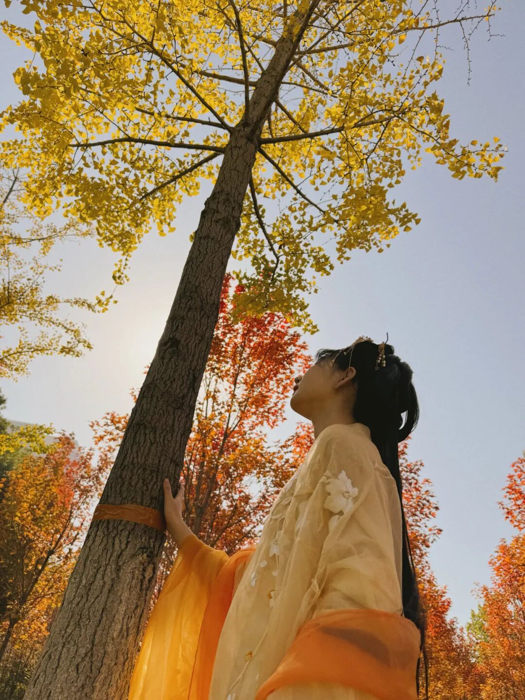汉服女生在银杏树下打卡